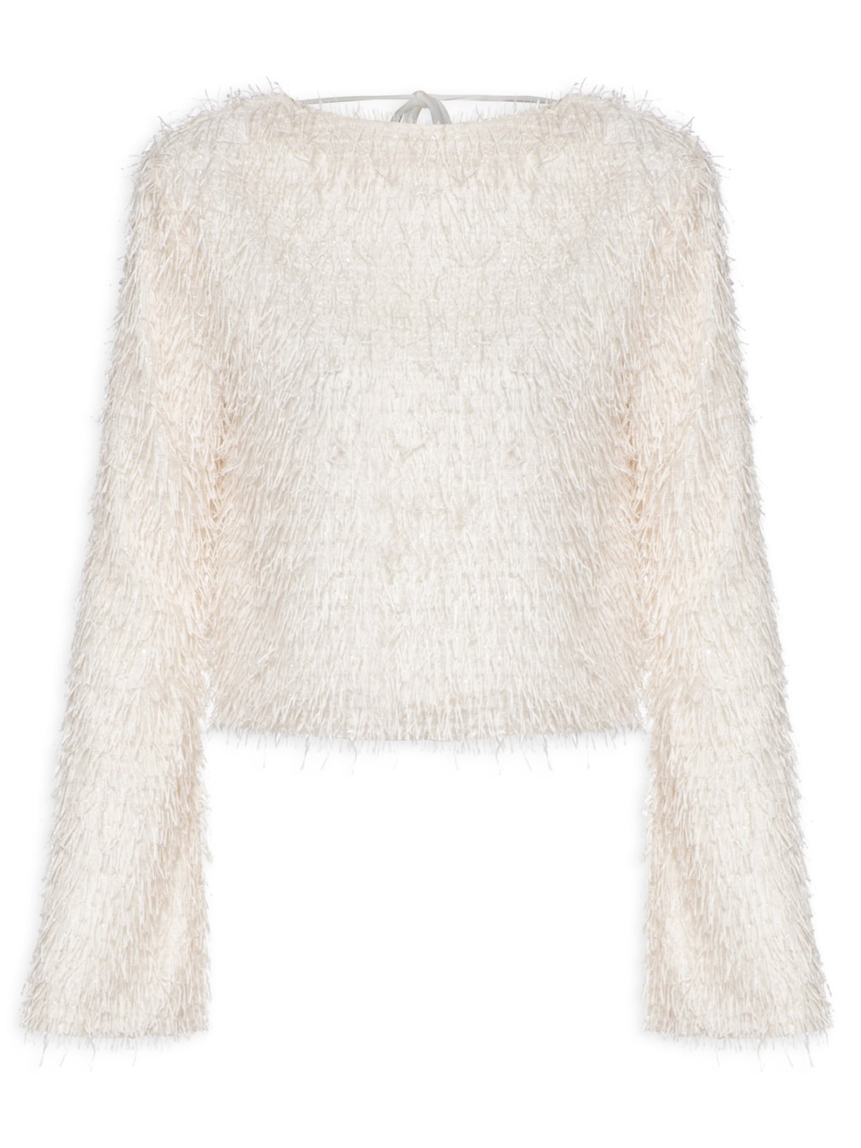 A blusa bege é confeccionada em tecido leve com superfície texturizada e baixa elasticidade. A peça solta ao corpo possui decote canoa, ombreiras embutidas, mangas longas de modelo flare*, aplicação de franjas, trama vazada com fios em tons contrastantes, forro, comprimento cropped** e fechamento posterior em recorte vazado com tiras aplicadas para amarração.