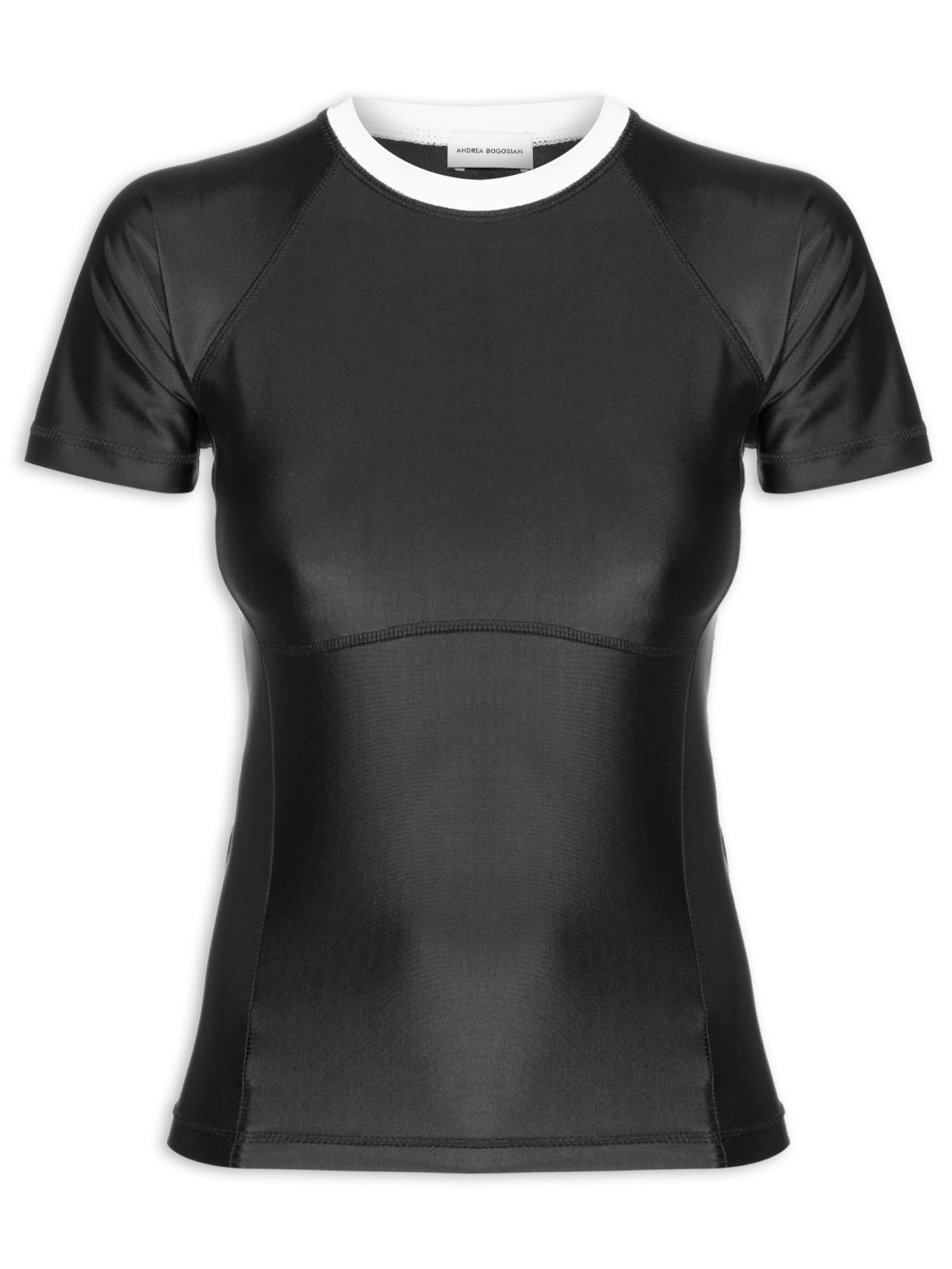 A blusa preta é confeccionada em malha leve de média elasticidade. A peça justa ao corpo, possui decote redondo na cor branca, mangas curtas de modelo raglan e recortes frontais e posteriores.