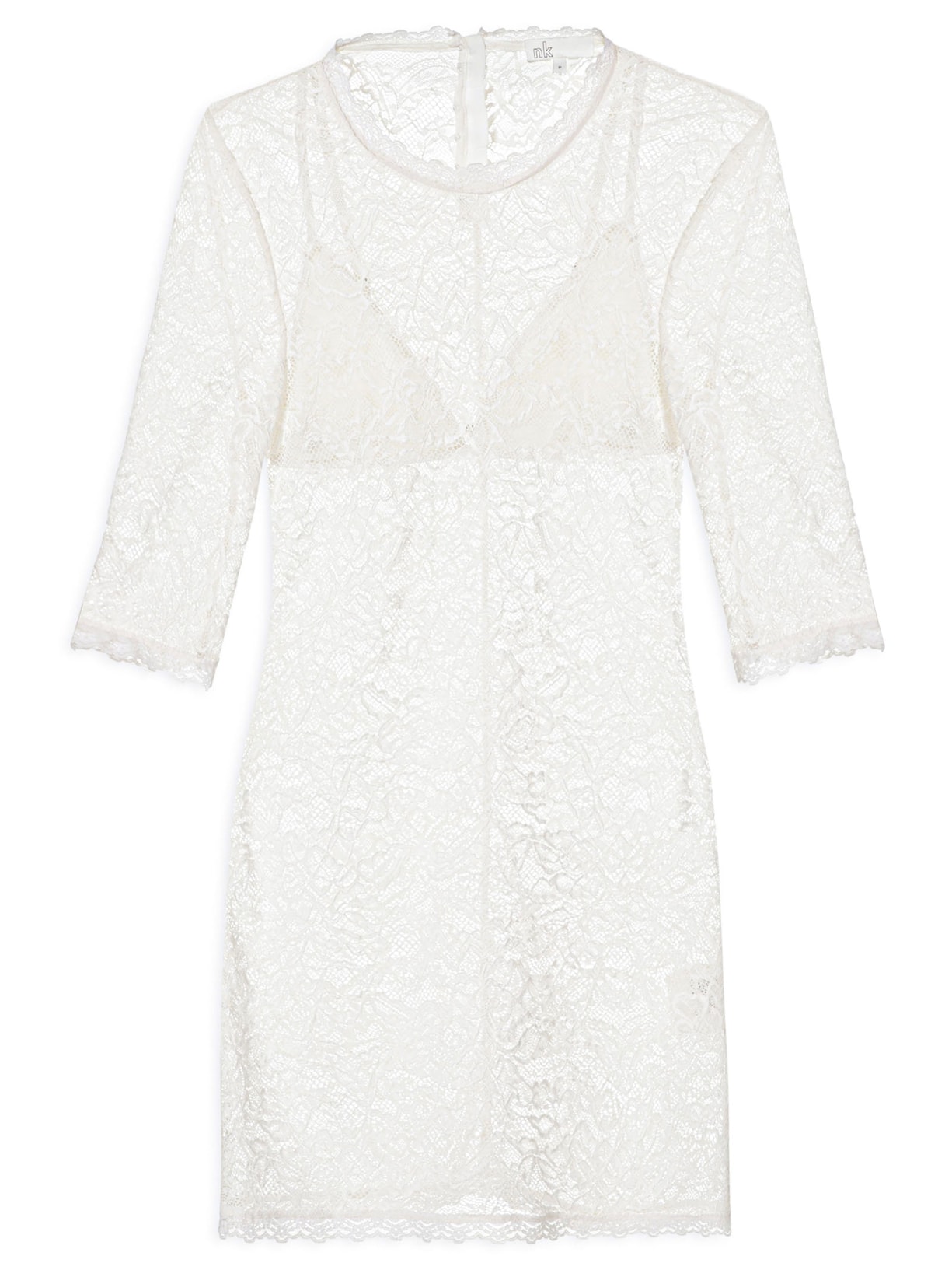 A blusa off white é confeccionada por renda com média elasticidade. A peça justa ao corpo possui decote redondo, mangas curtas, recorte posterior, alta transparência e comprimento alongado. Acompanha por top no modelo triangulo, decote V e alças finas com ajustes.