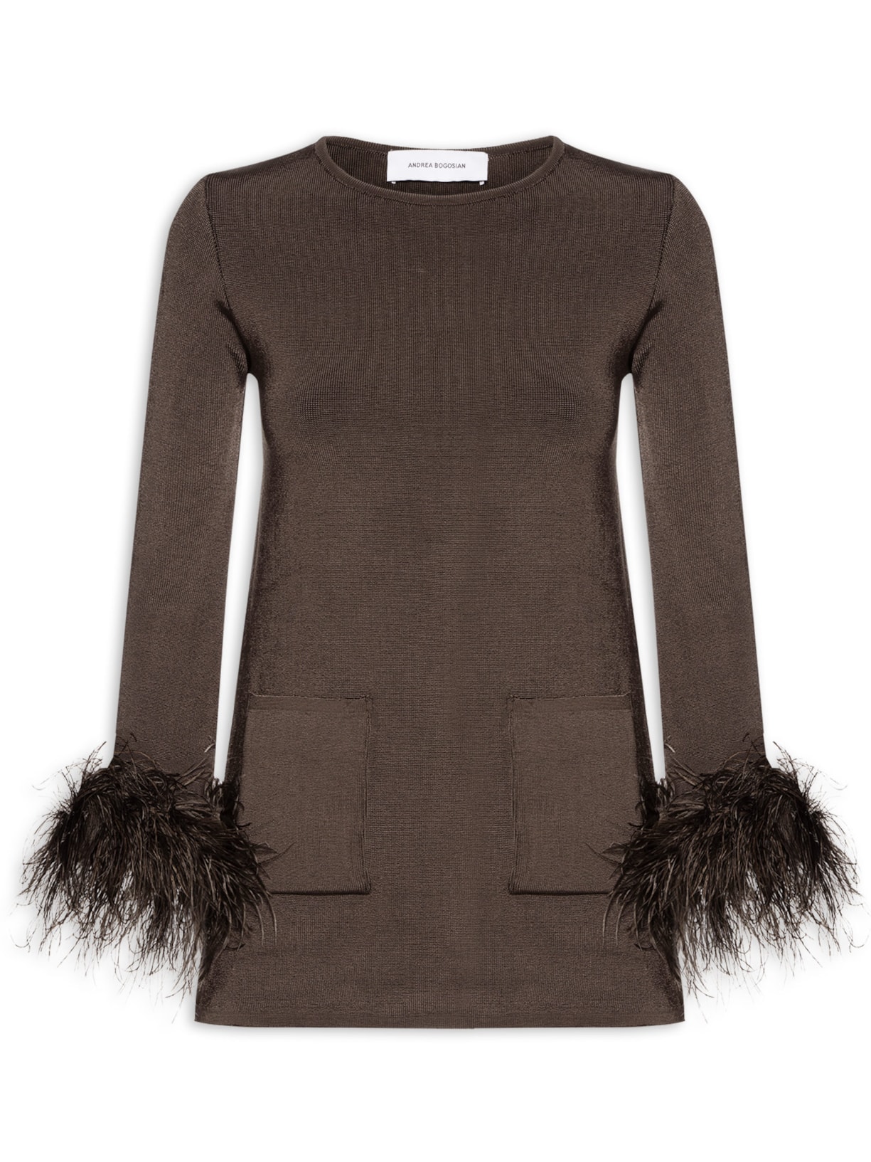A blusa marrom é confeccionada em tricot encorpado com alta elasticidade. A peça solta ao corpo possui decote redondo, mangas longas com plumas removíveis por cordão com botões de pressão e bolsos frontais.