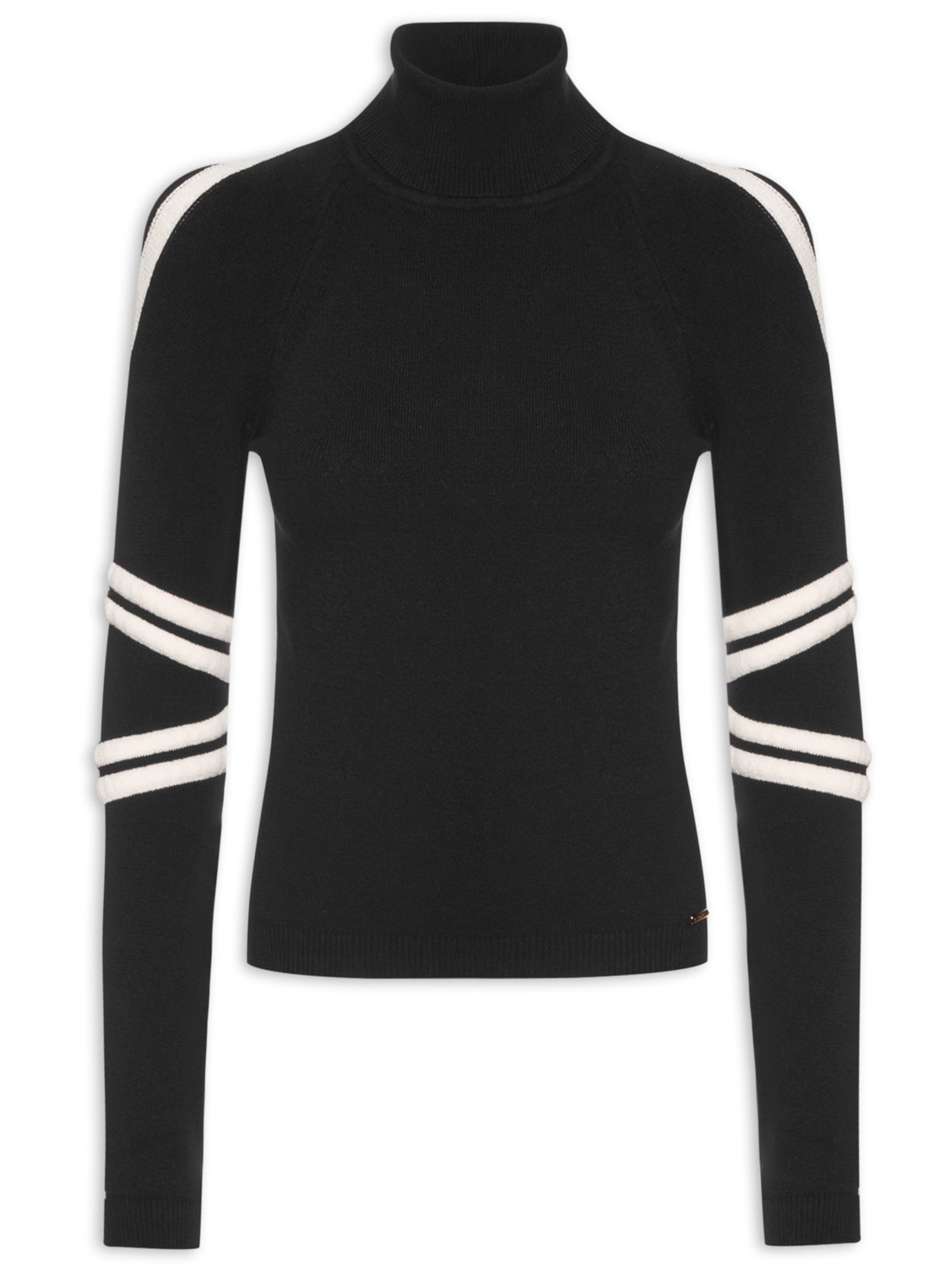 A blusa preta é confeccionada em tricot com média elasticidade. A peça justa ao corpo possui gola rolê, mangas longas, detalhes alto relevo na cor branca nas mangas e acabamento canelado nos punhos e barra.