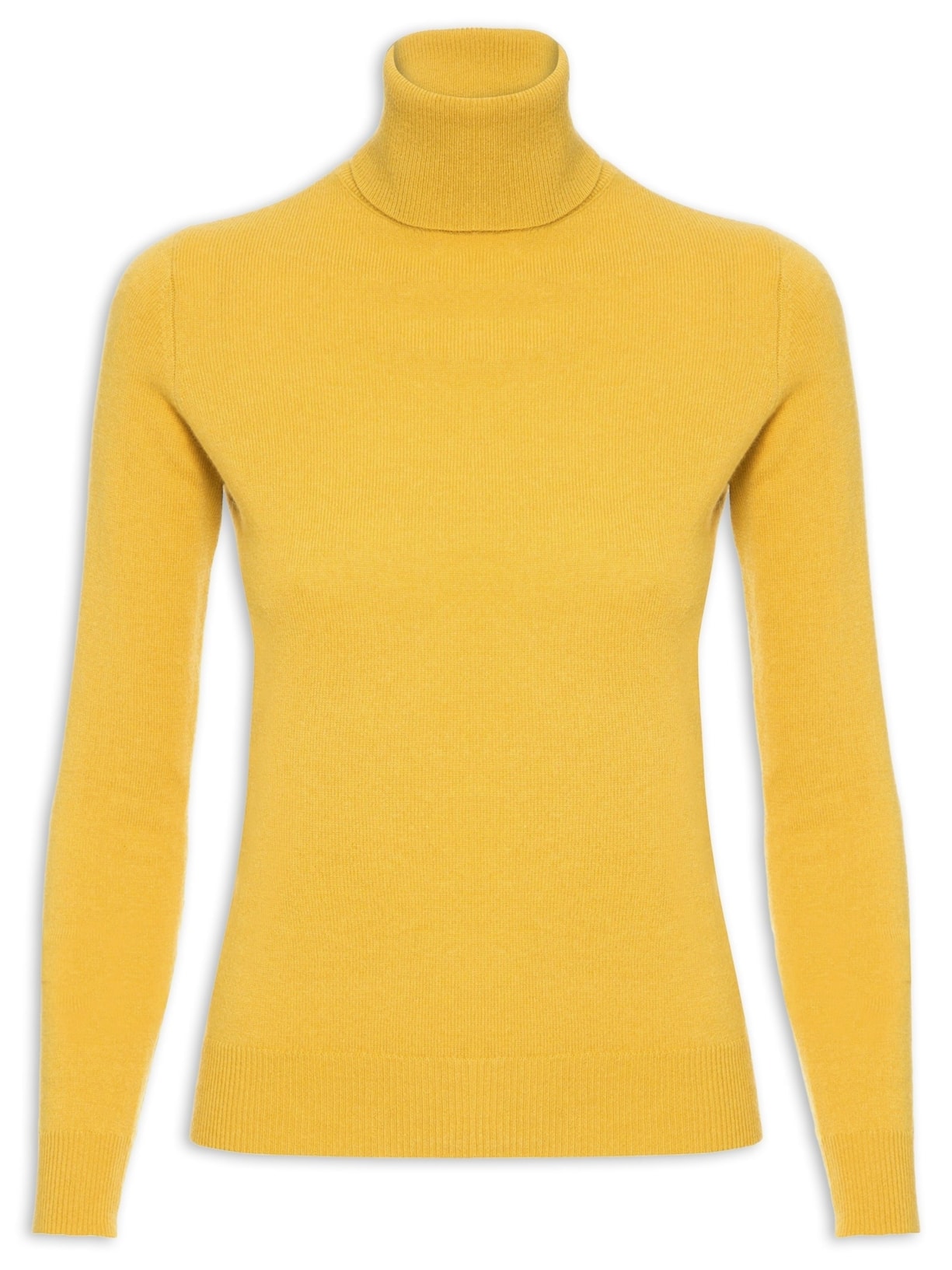 A blusa amarela é confeccionada em cashmere com modelagem reta. A peça possui mangas longas, gola rolê e acabamento canelado.