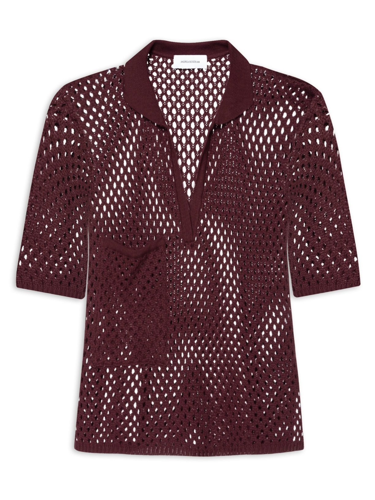 A blusa vinho é confeccionada em tricot de média elasticidade. A peça solta ao corpo possui gola simples, ombros estendidos, mangas curtas, bolso frontal, fendas laterais, trama com recortes vazados, sem forro e acabamento canelado.