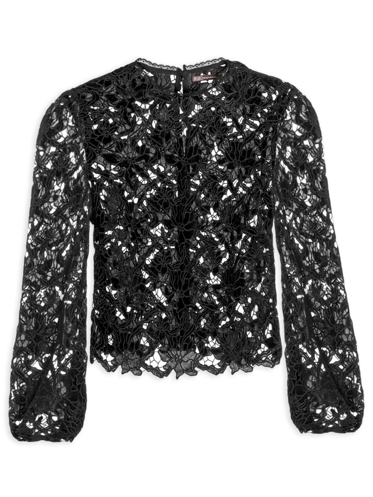 A blusa preta é confeccionada em renda com toque aveludado e sem elasticidade. A peça solta ao corpo possui decote arredondado com detalhe de aplicação de renda, mangas longas amplas com elástico embutido nos punhos, forro, transparência, abertura posterior com fechamento por botão e fechamento posterior por zíper.