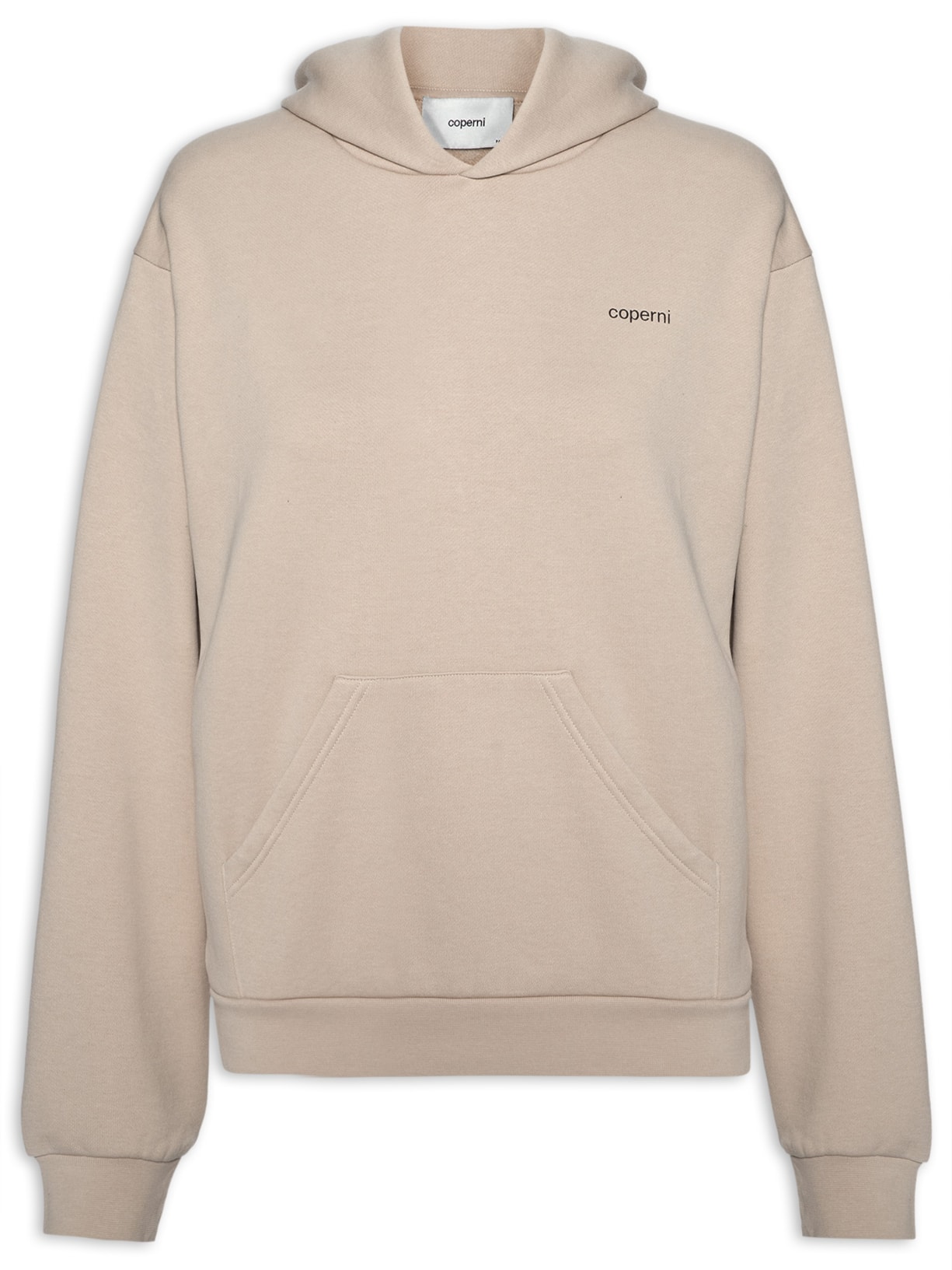 A blusa bege é confeccionada em moletom flanelado com baixa elasticidade. A peça solta ao corpo possui capuz, mangas longas com ajuste nos punhos, ombros estendidos, nome da marca estampado na altura do busto e bolso frontal modelo canguru.