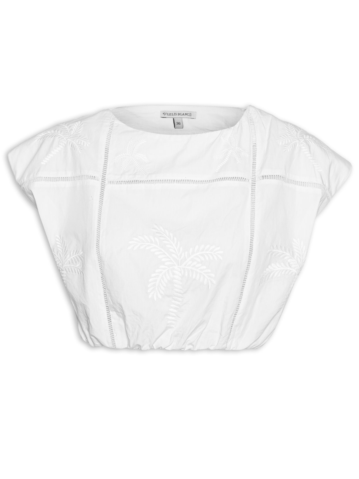 A blusa branca é confeccionada por tecido leve sem elasticidade. A peça solta ao corpo possui decote redondo, mangas curtas, recortes vazados frontais com bordados, bordados figurativos frontais e posteriores, tag da marca metalizada na gola posterior, barra com elástico embutido e comprimento cropped*.