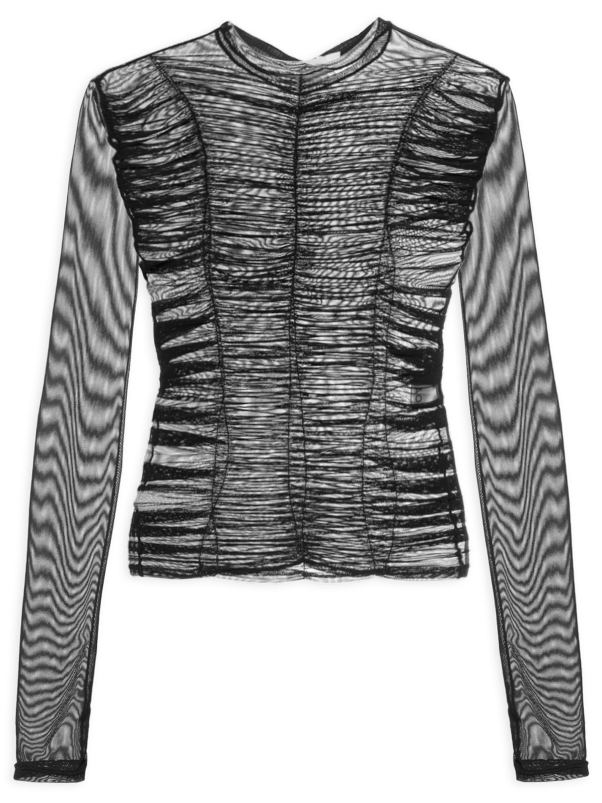 A blusa preta é confeccionada em tule com alta elasticidade. A peça justa ao corpo possui decote redondo, mangas longas, transparência, recortes posteriores e frontais com detalhe de drapeado nas partes posterior e frontal.