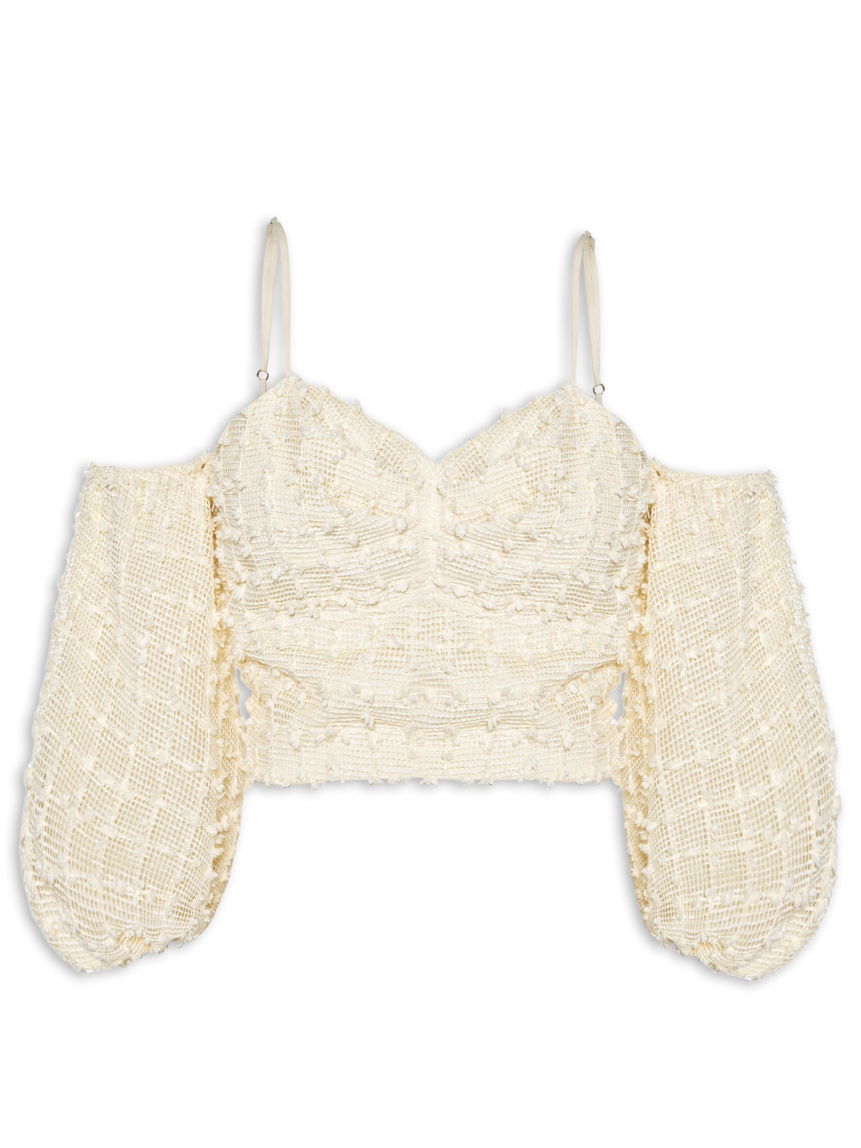 A blusa off white é confeccionada em tela com superfície flocada sem elasticidade. A peça solta ao corpo, possui decote coração, alças finas com regulagem, mangas curtas deslocadas de modelo bufante, elástico embutido no punho, detalhes de pregas frontais, lastex aplicado na parte posterior, comprimento cropped*, forro e fechamento posterior por zíper metálico.
