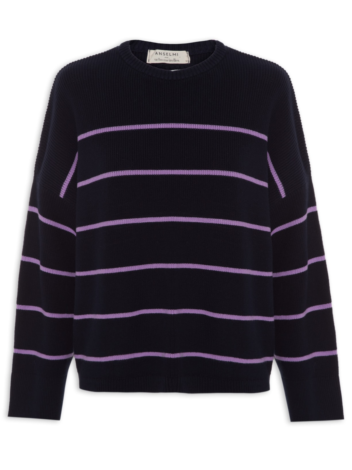 A blusa azul é confeccionada em tricot. A peça possui decote redondo, mangas longas, padronagem de listras em cor contrastante, ombros estendidos, recorte posterior vazado em formato arredondado, shape solto, caimento reto e acabamento canelado.