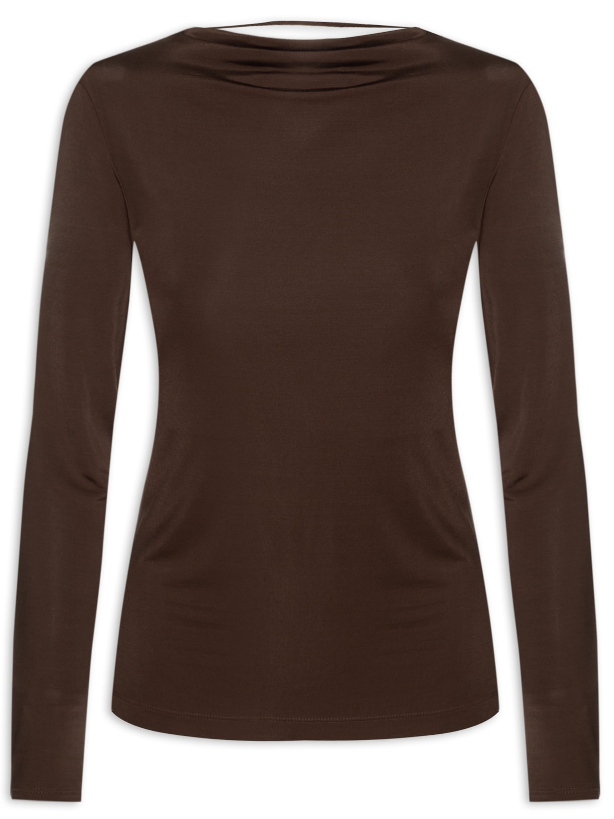 A blusa marrom é confeccionada em malha com alta elasticidade. A peça justa ao corpo possui decote frontal e posterior degagê e mangas longas.