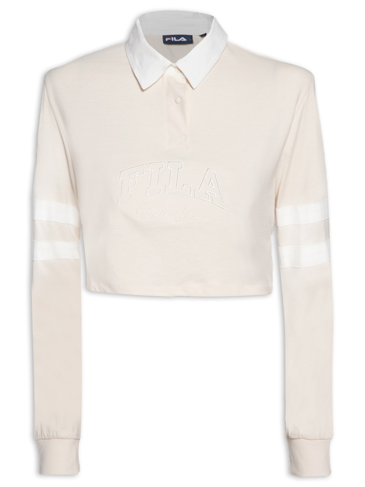 A blusa bege é confeccionada em malha com média elasticidade. A peça solta ao corpo possui gola esporte off white com botões de pressão aplicados, mangas longas com ajuste nos punhos e recortes em listras em cor contrastante, nome da marca e escrita bordada em cor contrastante na parte frontal, fendas laterais curtas e comprimento cropped*.