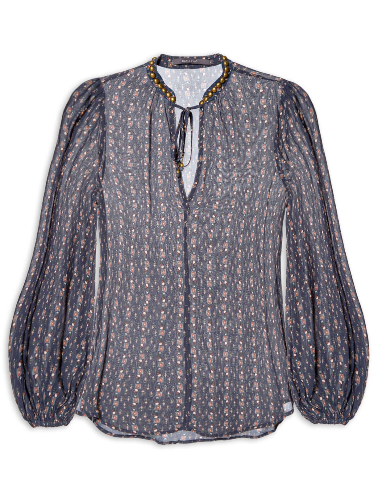 A blusa azul é confeccionada em crepe sem elasticidade. A peça solta ao corpo possui decote em V com cordão aplicado para amarração frontal e gola padre com tachas metálicas aplicadas, mangas longas com elástico embutido nos punhos e leve franzido nos ombros, fendas laterais, barra arredondada, mix de estampas em cores contrastantes e leve transparência.