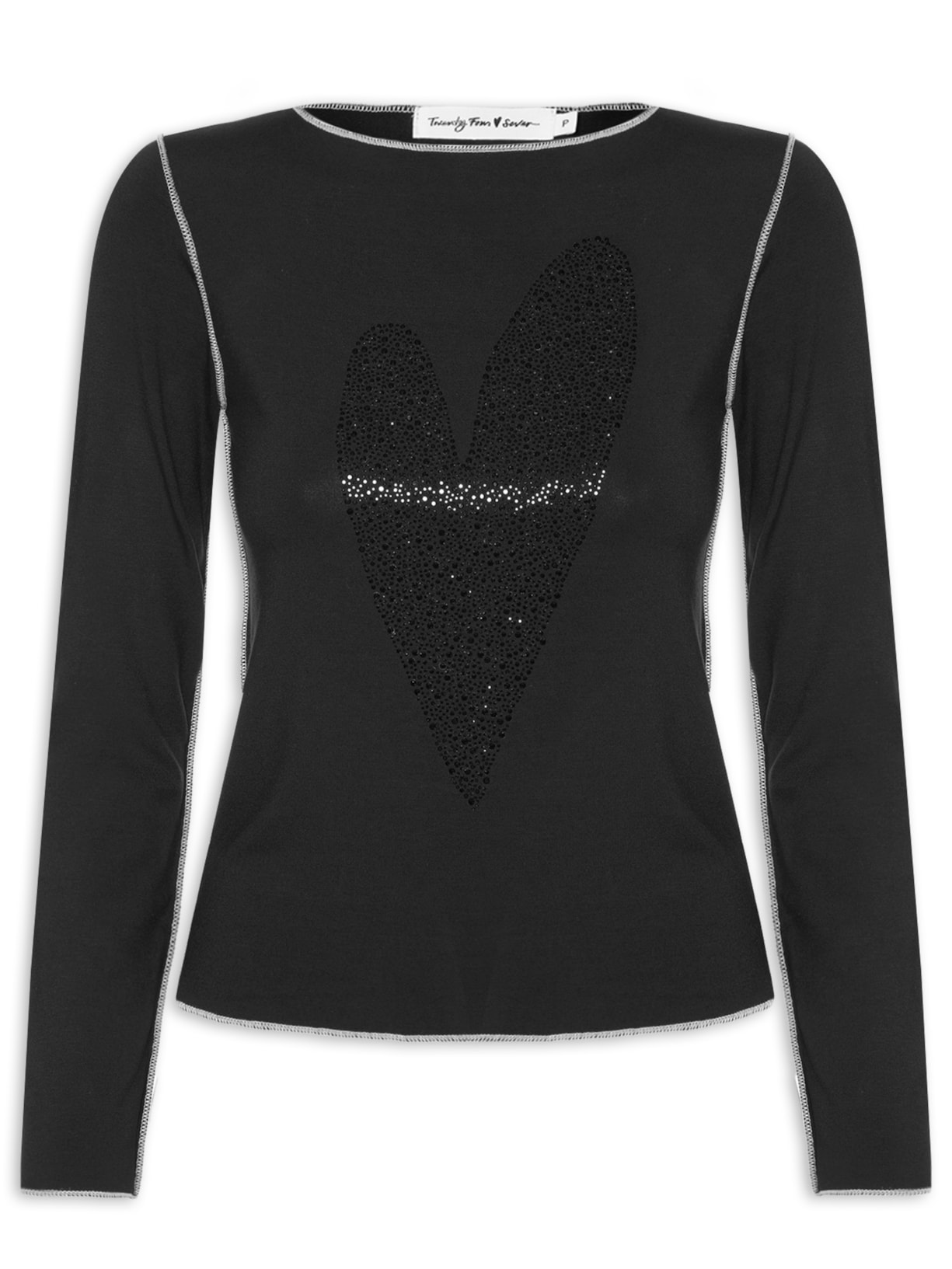 A blusa preta é confeccionada em malha de média elasticidade. A peça justa ao corpo possui decote canoa, mangas longas, aplicação de strass em formato figurativo de coração na parte frontal e acabamento overlocado na cor branca.