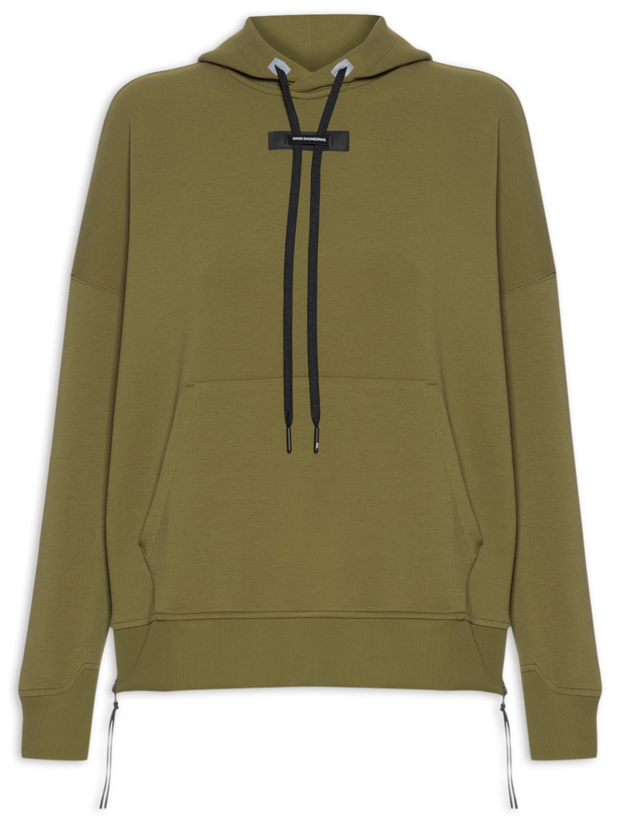 A blusa verde é confeccionada em moletom com baixa elasticidade. A peça solta ao corpo possui capuz e cordão embutido para ajuste, ombros estendidos, mangas longas, bolso frontal modelo canguru, tag da marda na parte frontal, tag da marca aplicada na parte posterior, recortes laterais com aplicação de zíper e punhos e barra com acabamento canelado.