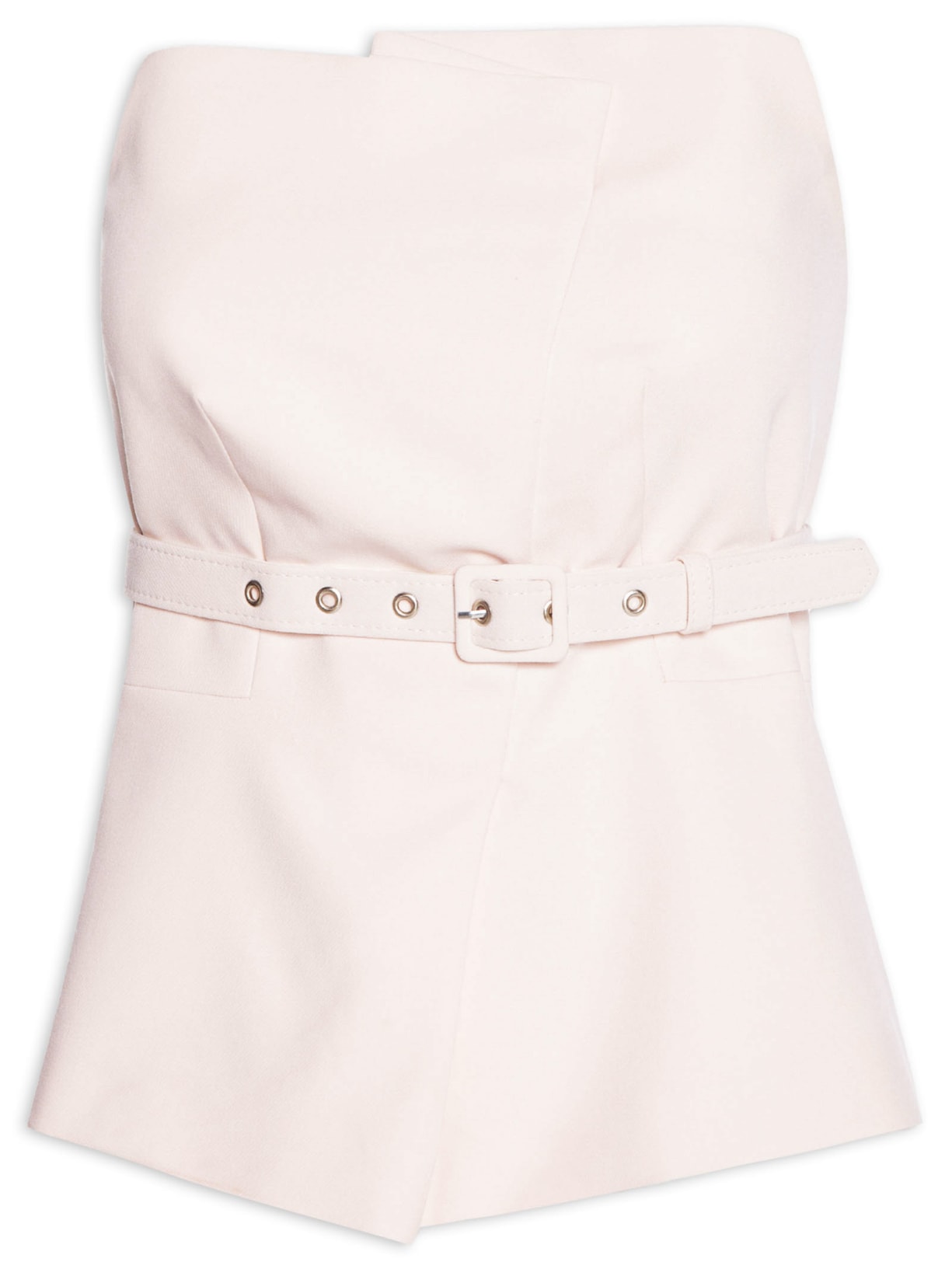 A blusa rosa é confeccionada por tecido leve sem elasticidade. A peça justa ao corpo possui decote tomara que caia, recorte frontal, recortes posteriores, forro e fechamento por zíper posterior. Acompanha cinto com espessura média, seis perfuros com ilhoses aplicadas, passante fixo e fechamento por fivela.
