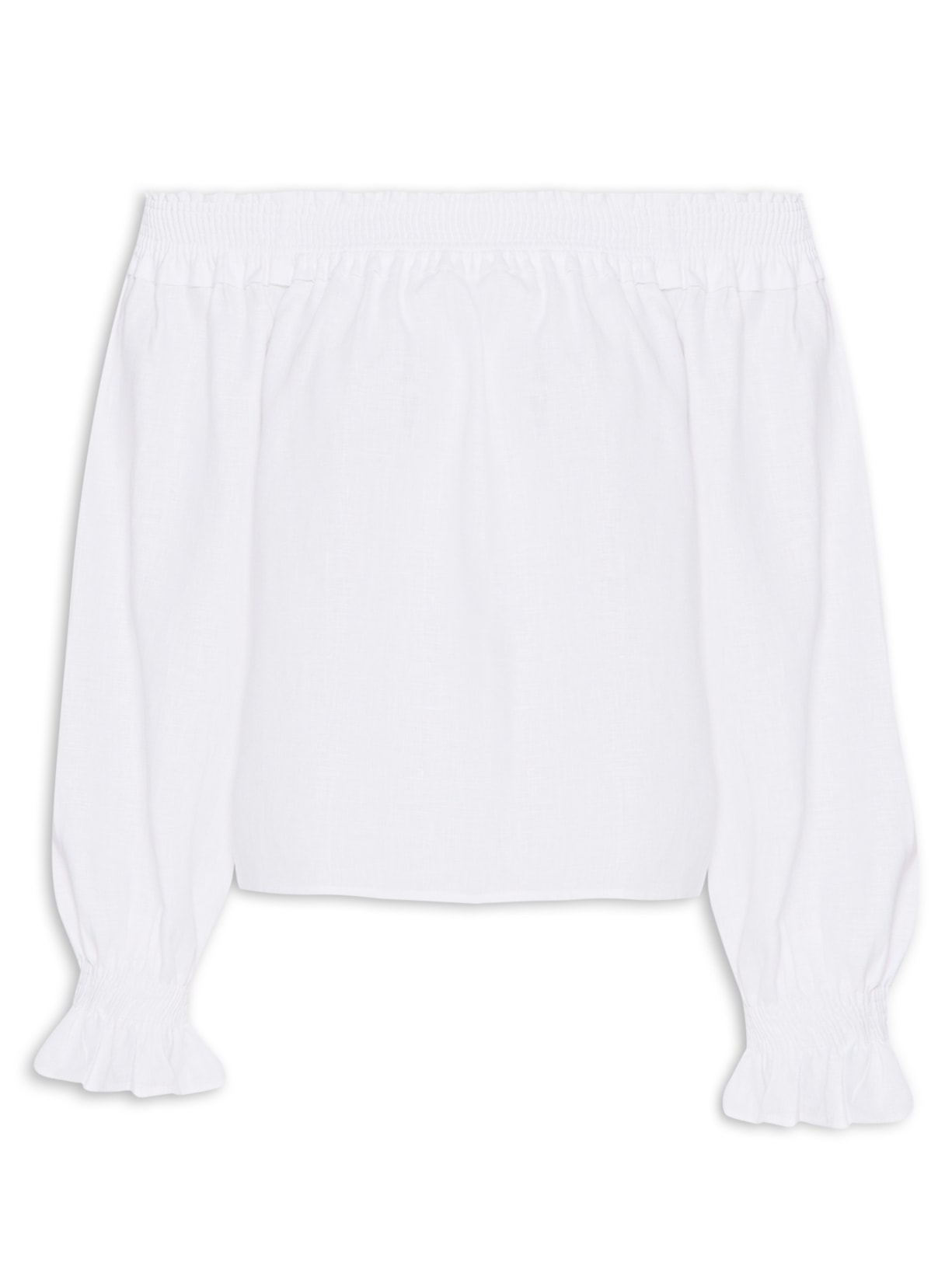 A blusa off white é confeccionada por linho sem elasticidade. A peça solta ao corpo possui decote ombro a ombro com lastex aplicado, mangas longas com lastex aplicado nos punhos, tag da marca metalizada aplicada na parte posterior, leve transparência e barra arredondada.