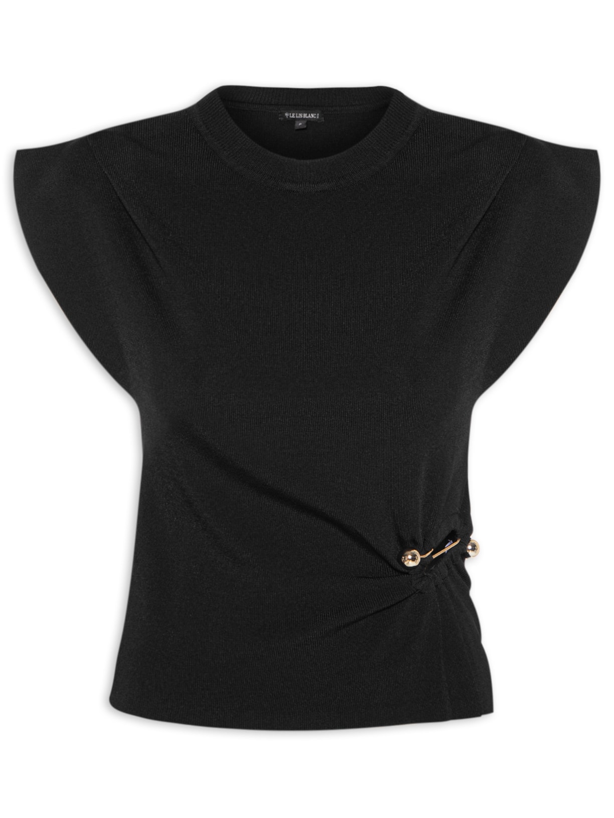 A blusa preto é produzida por malha canelada com alta elasticidade. A peça solta ao corpo corpo possui decote redondo, mangas curtas, pregas aplicadas nos ombros, recorte frontal vazado com aplicação metalizada embutida e barra com acabamento corte a fio.