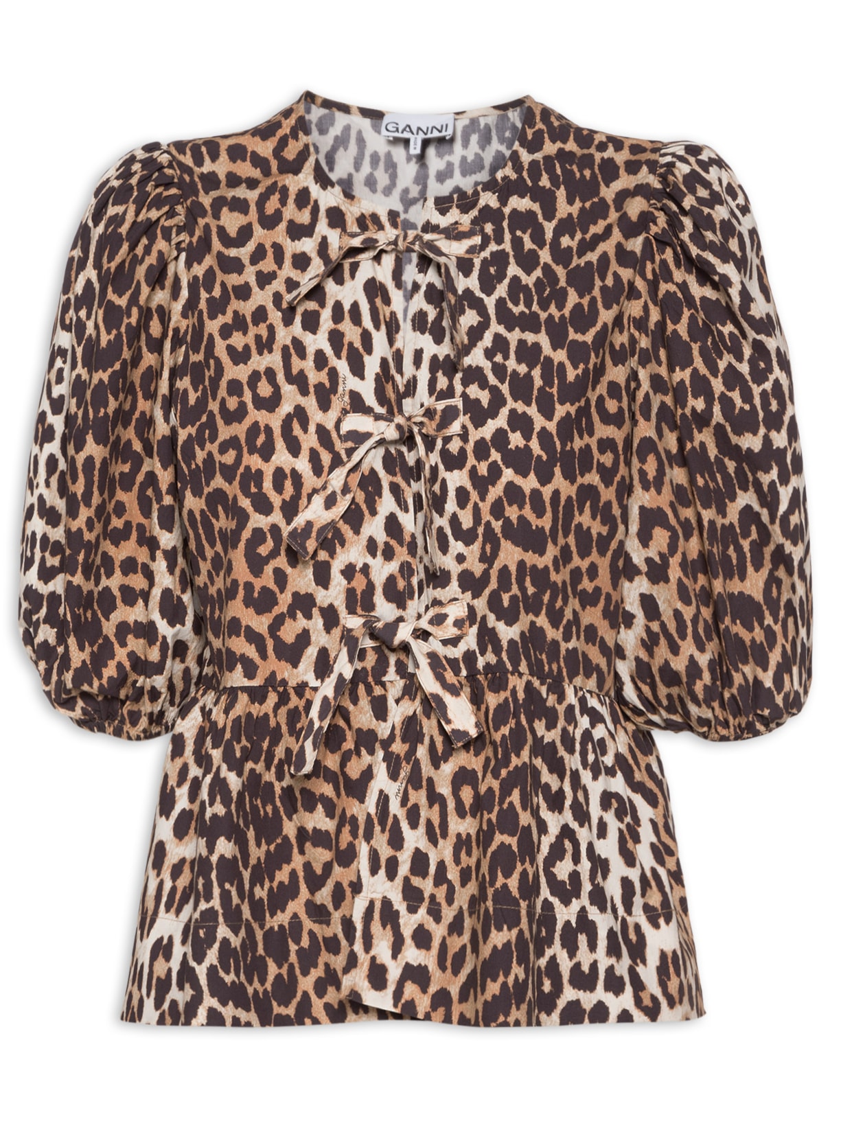 Com um grande leque de variações que se adequa à quase todas as ocasiões, o animal print continua sendo o curinga dos looks mais criativos e contemporâneos. Aposte nesta blusa da Ganni com uma calça jeans, slingback, bolsa, chocker e brincos metalizados para finalizar.