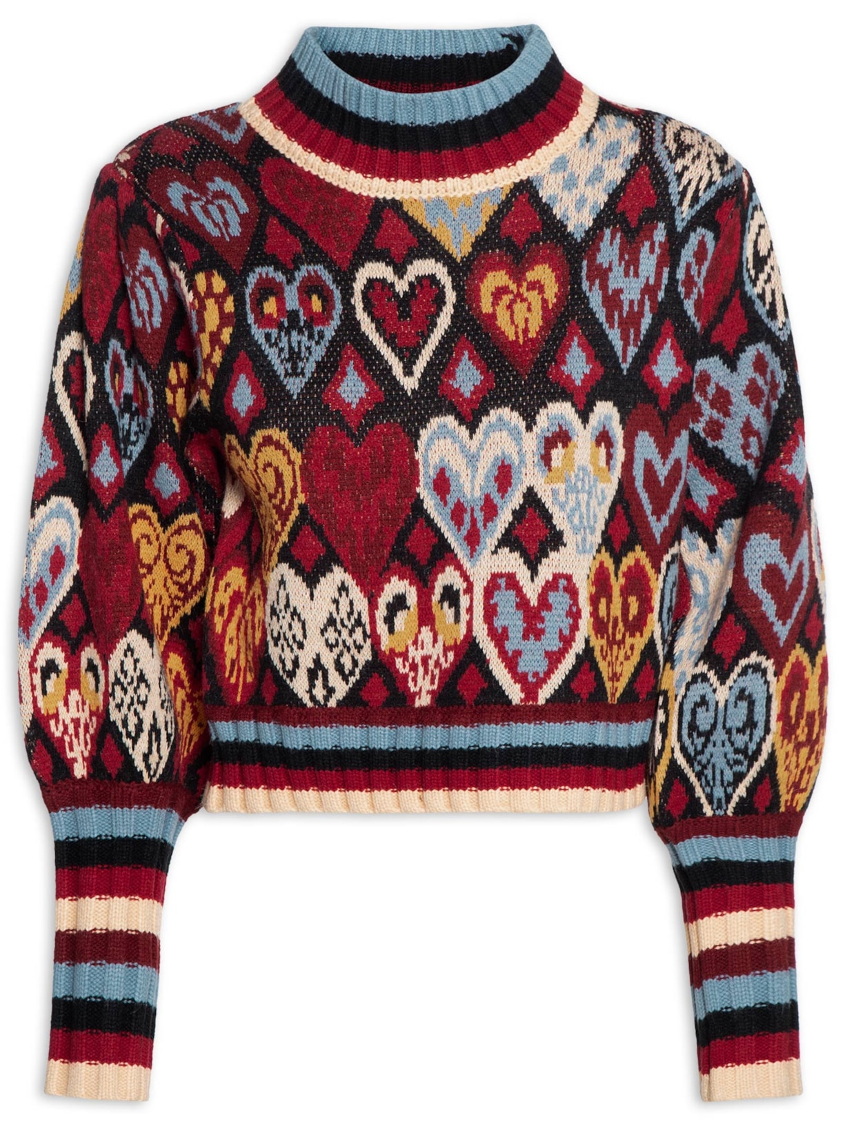 A blusa preta é confeccionada em tricot de alta elasticidade. A peça solta ao corpo possui gola alta, mangas longas, padronagem figurativa de corações e listrada em cores contrastantes, comprimento cropped* e acabamento canelado.