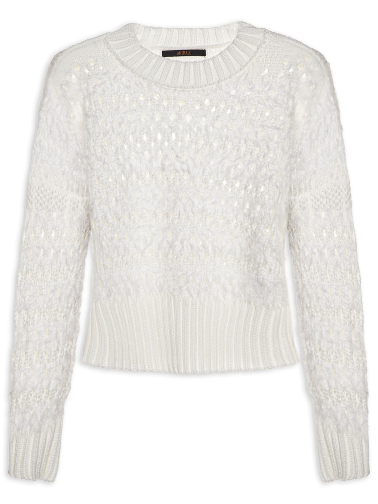 A blusa off white é confeccionada em tricot com superfície em pelos. A peça possui decote redondo, mangas longas com ajuste nos punhos, ombros estendidos, barra ajustada, shape solto, caimento reto e acabamento canelado.