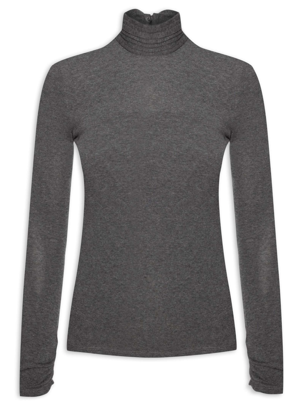 A blusa cinza é confeccionada em malha fina de viscose com alta elasticidade. A peça justa ao corpo possui gola alta com detalhe de pregas, mangas longas com detalhe de franzido nos punhos, recorte posterior com botões aplicados, transparência e barra mullet*.