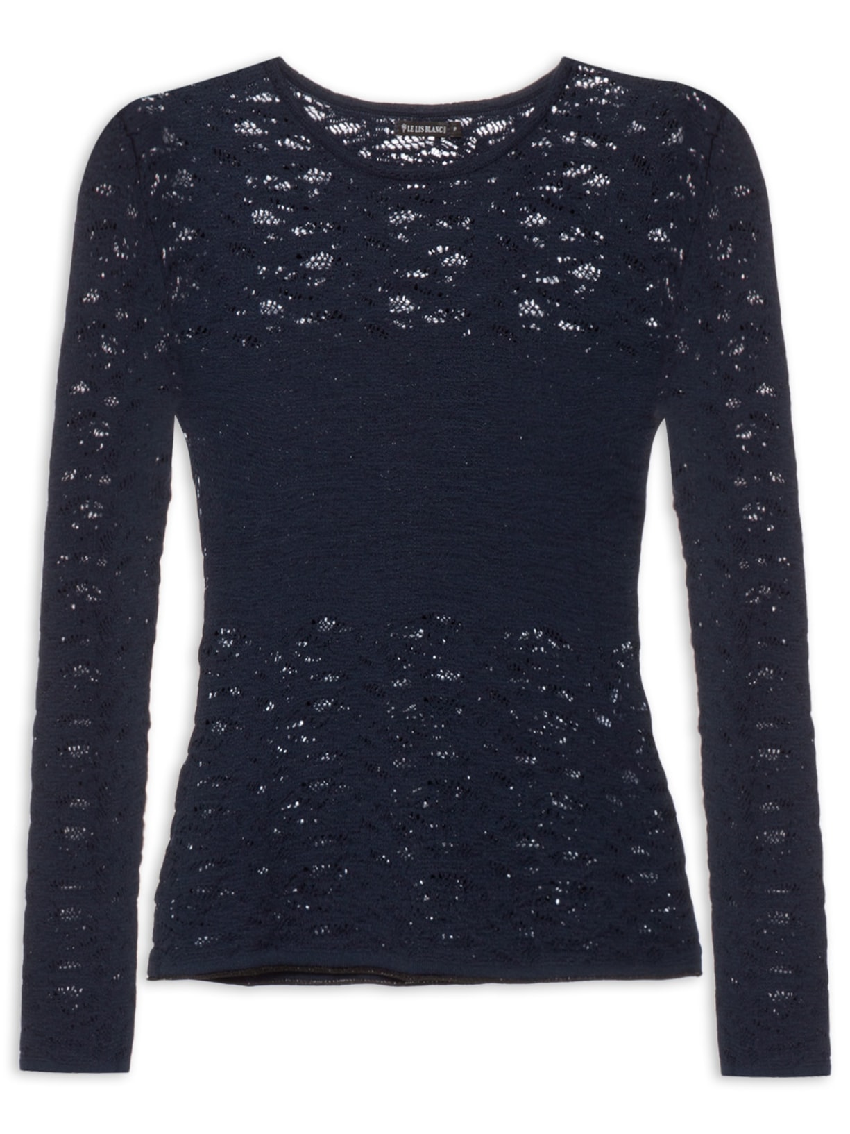 A blusa azul marinho é confeccionada em tricot com alta elasticidade. A peça solta ao corpo possui decote redondo, mangas longas, transparência e logo da marca aplicado em metal na parte posterior na altura do decote.