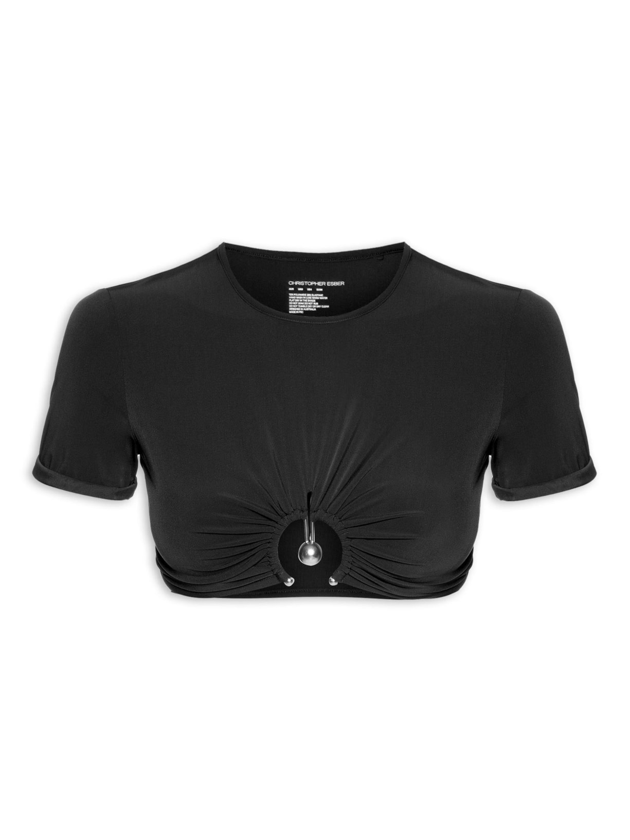 A blusa preta é confeccionada em malha de poliamida com média elasticidade. A peça justa ao corpo possui decote redondo, mangas curtas com barra italiana, recorte frontal vazado com aplicação de aviamento metálico com detalhe de esferas em tamanhos distintos e acabamento fosco, tecido duplo frontal e comprimento cropped*.