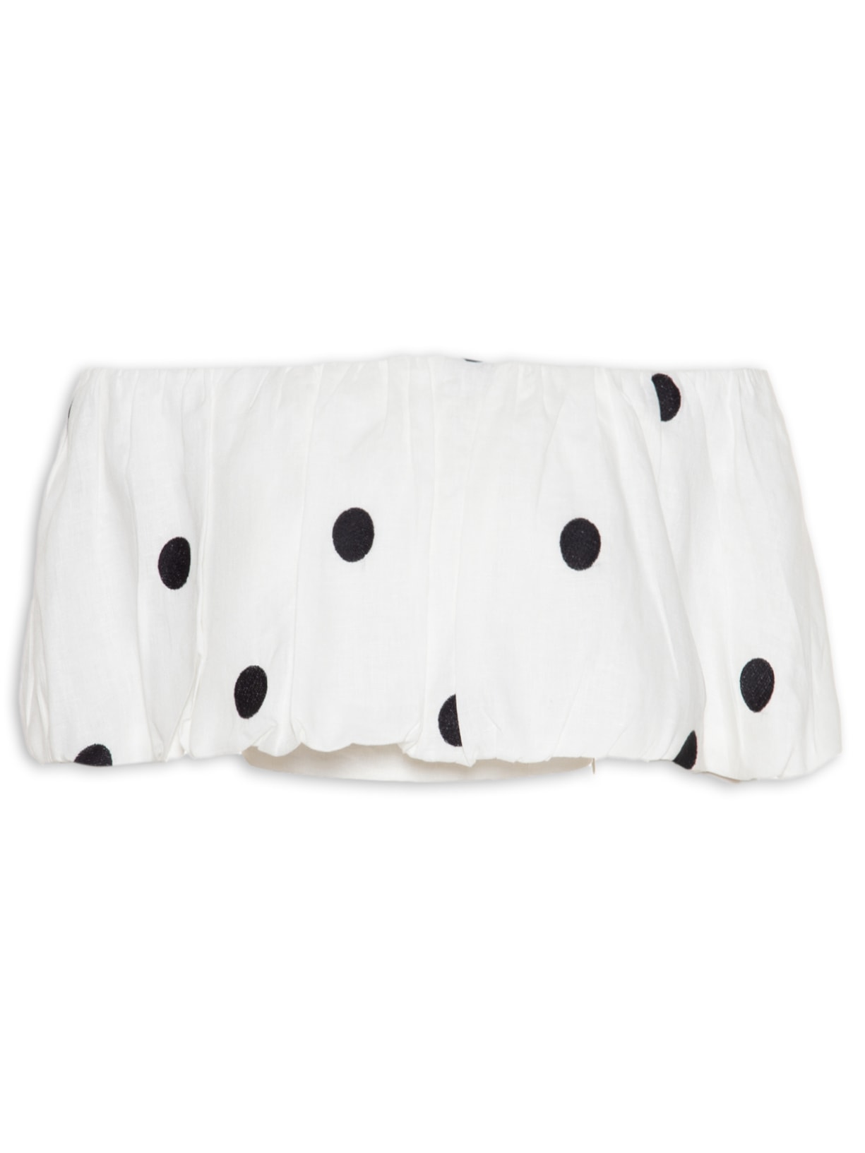 A blusa branca é confeccionada em linho sem elasticidade. A peça justa ao corpo de modelo ombro à ombro possui decote reto com elástico embutido e babado sobreposto, mangas curtas, parte posterior do forro com lastex aplicado, tag metalizada da marca aplicada na parte posterior, comprimento cropped*, poá bordado em cor contrastante e fechamento lateral por zíper invisível.