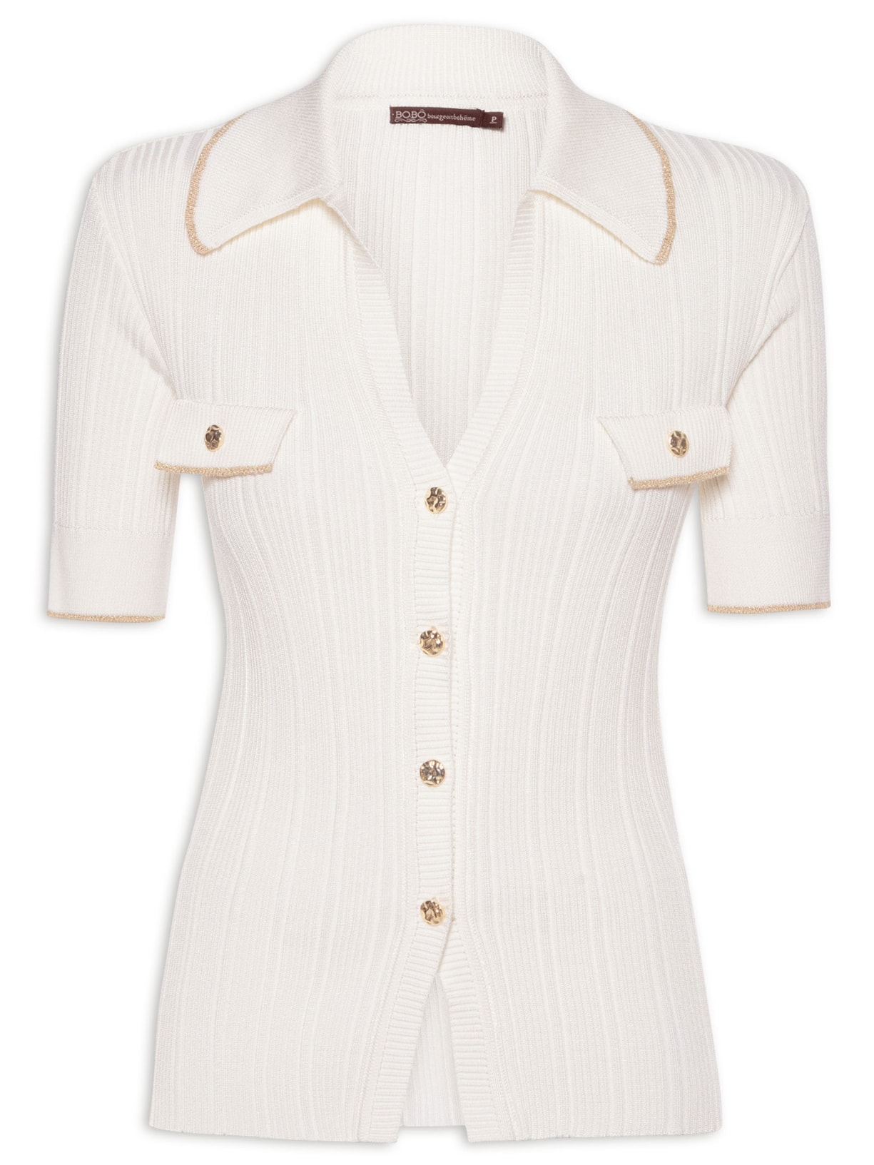 A blusa off white é confeccionada em tricot com alta elasticidade. A peça solta ao corpo possui colarinho clássico, mangas curtas, tag da marca aplicada em metal na parte posterior, detalhe de frisos na cor bege com fios de lurex dourados no colarinho, mangas e na parte frontal, abas sobrepostas na parte frontal com botões aplicados e fechamento frontal por botões.
