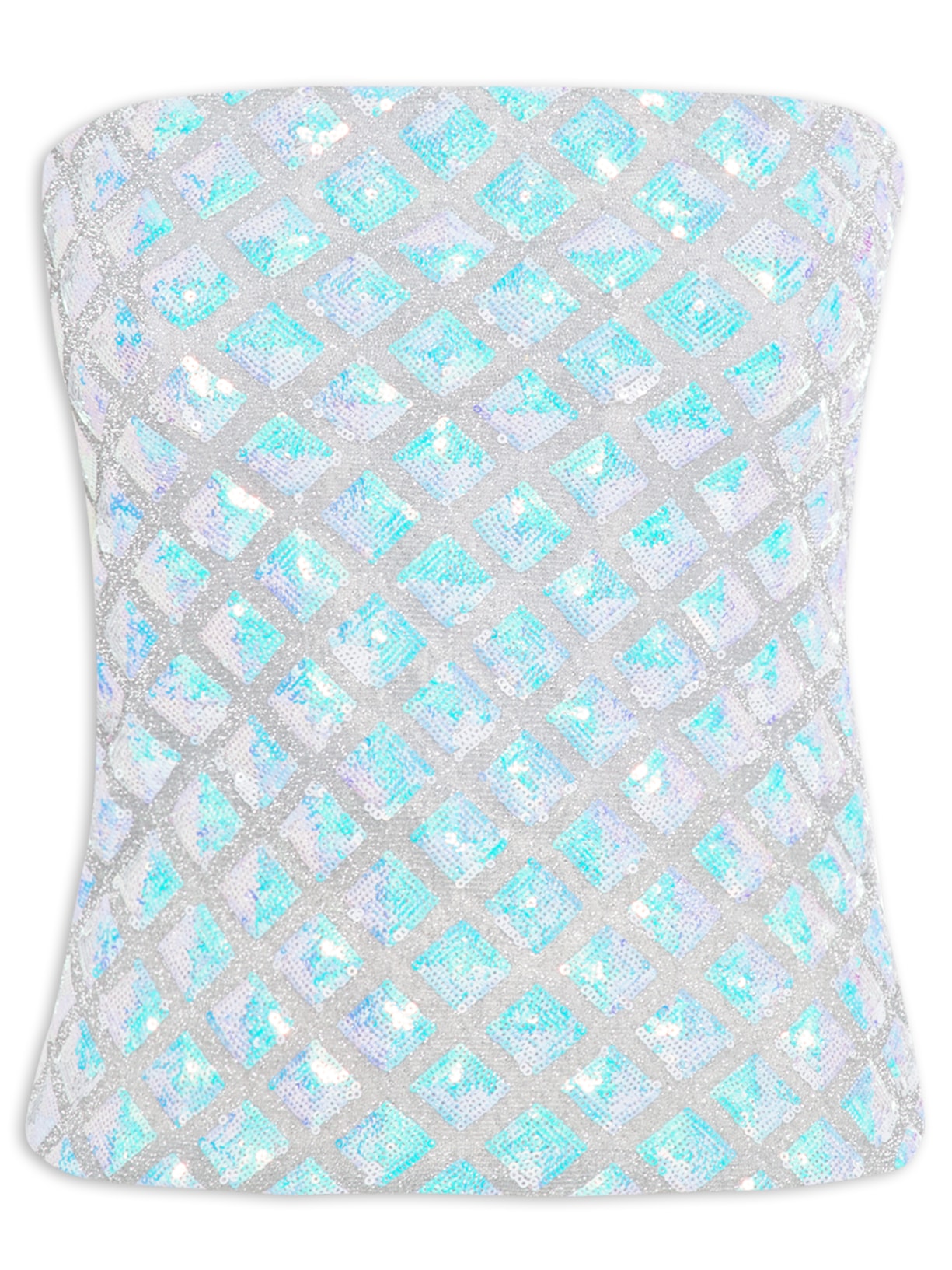 A blusa prateada é confeccionada em malha fina com fios de luréx. A peça de modelo tomara que caia possui decote reto, meio forro em tule com barbatanas e fechamento lateral por zíper, padronagem geométrica em paetê e shape justo.