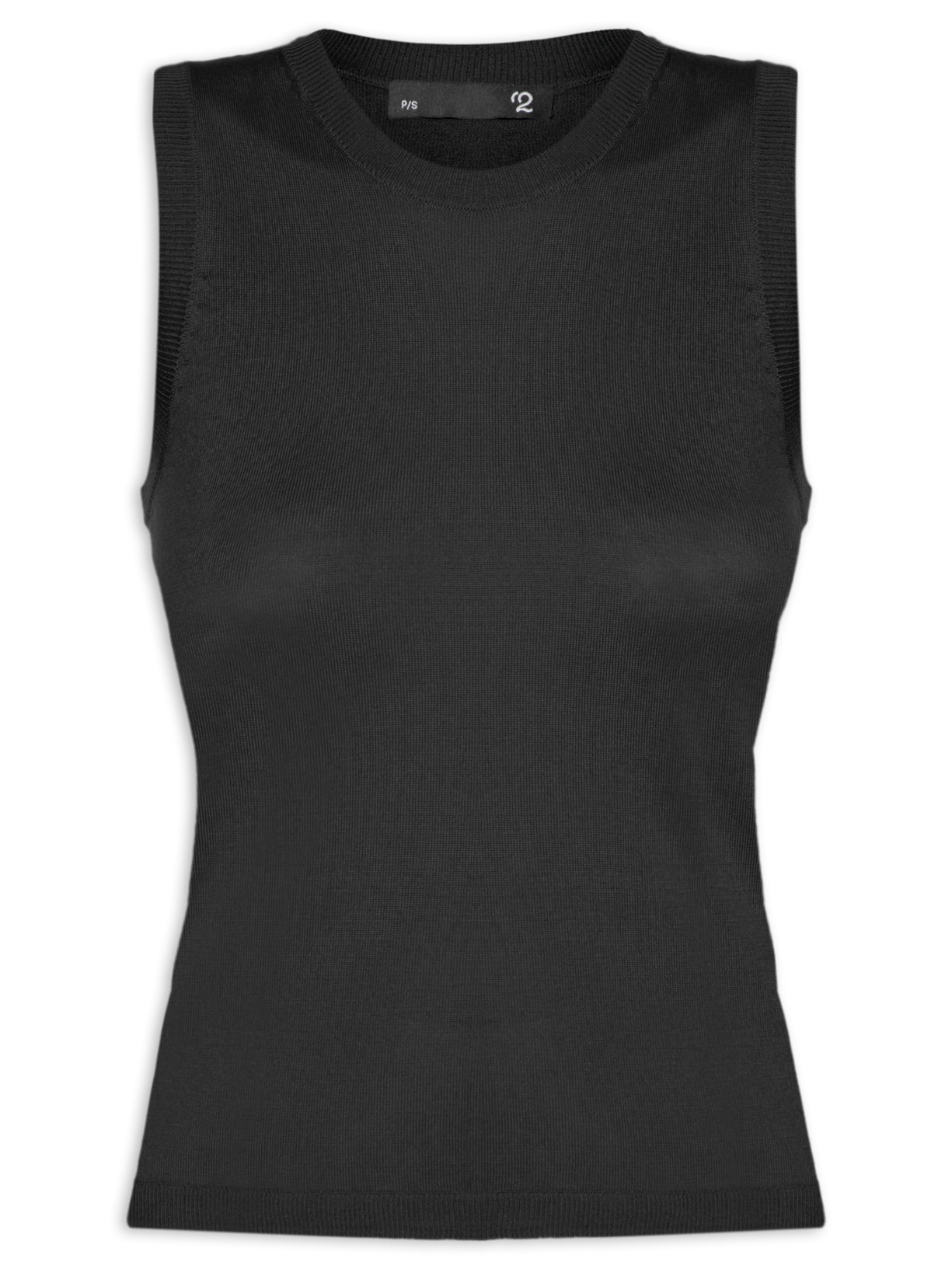 A blusa preta é confeccionada em seda mista com superfície texturizada e toque de cashmere com alta elasticidade. A peça possui decote redondo, cavas regulares, alças médias e acabamento canelado no decote, cavas e barra.
