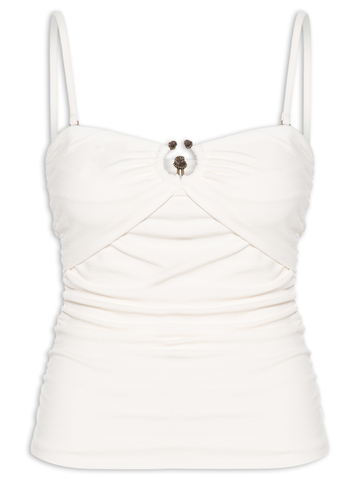 A blusa off white é confeccionada em malha com superfície texturizada e alta elasticidade. A peça justa ao corpo possui decote reto com aviamento metálico aplicado na parte frontal, alças finas removíveis, sem bojo, sobreposição na altura do busto, franzidos nas pastes laterais, drapeado e forro.