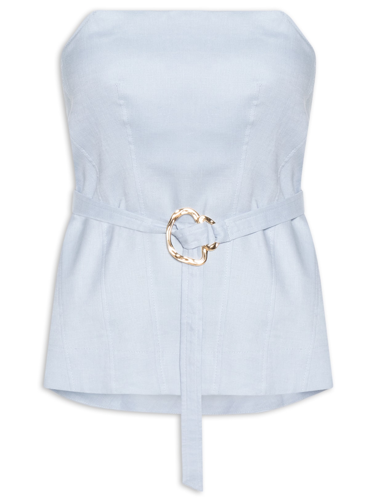 A blusa azul é confeccionada em linho sem elasticidade. A peça justa ao corpo, de modelo tomara que caia, possui decote reto, recortes frontais e posteriores, tag metalizada da marca aplicada na parte posterior do decote, tira dupla elástica embutida na parte interna do busto com encaixe metálico para sustentação, forro e fechamento posterior por zíper invisível. Acompanha cinto fino em mesmo tecido e com fechamento frontal por fivela metálica em formato orgânico.