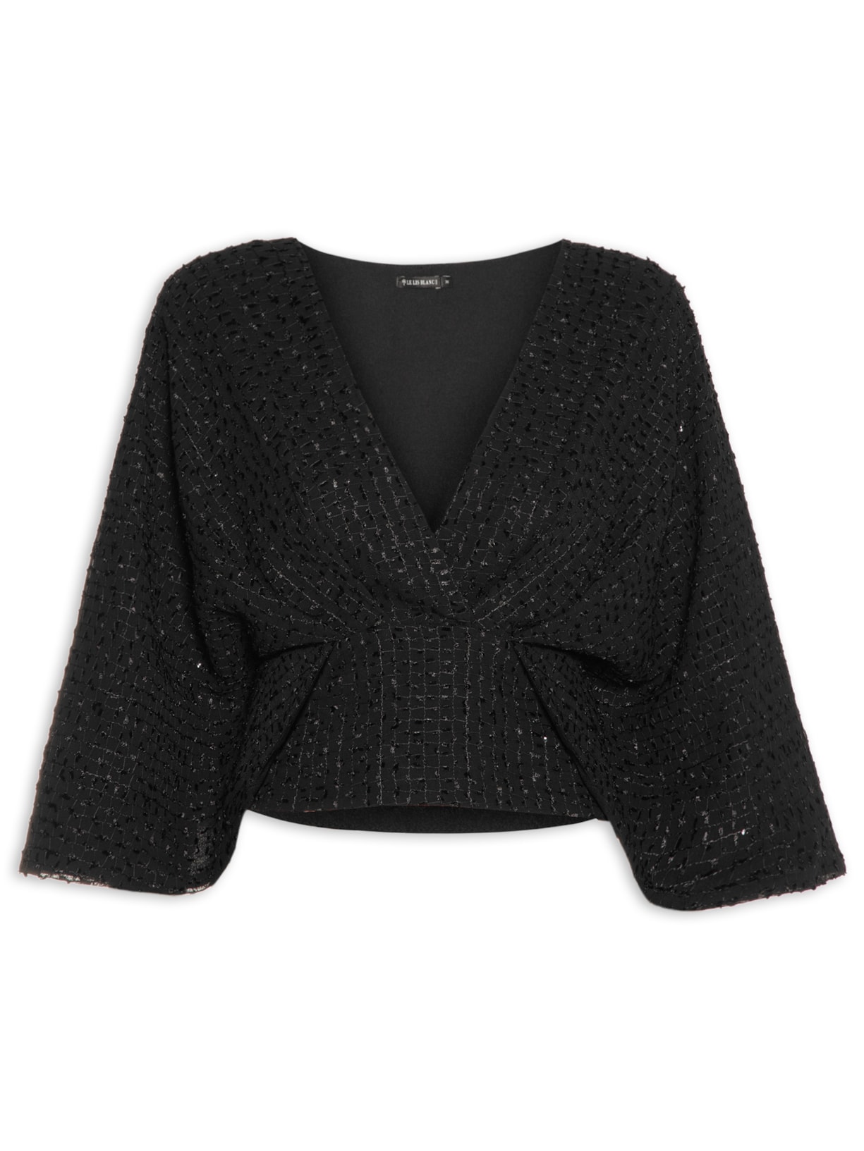 A blusa preta é confeccionada em tecido leve com superfície texturizada. A peça possui decote V profundo transpassado com logo da marca aplicado em metal na parte posterior, mangas 3/4 amplas com detalhe de sobreposição frontal e posterior, bordado quadriculado com detalhes em relevo e aplicações de paetê, forro, recorte na altura da cintura, comprimento cropped*, shape solto e fechamento lateral por zíper invisível.