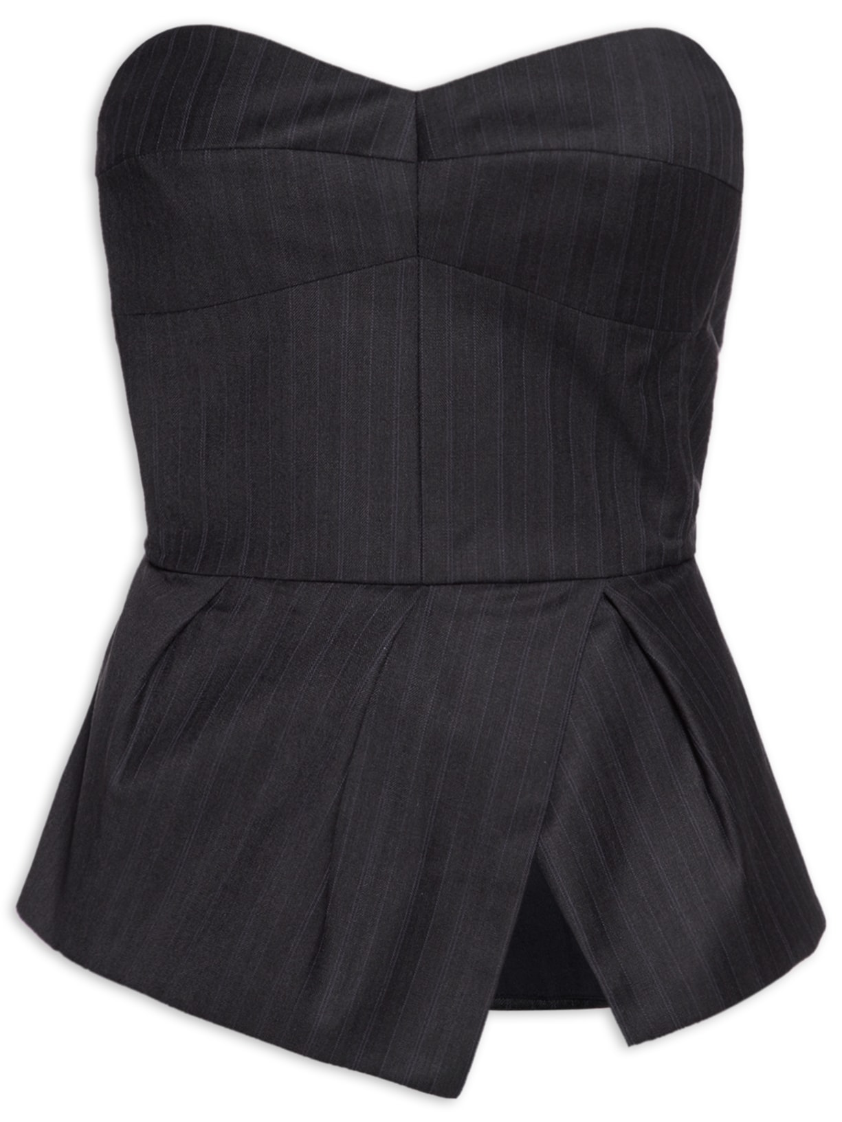 A blusa cinza é confeccionada em lã sem elasticidade. A peça justa ao corpo de modelo tomara que caia possui decote meia taça, recortes frontais, pences posteriores, barbatanas embutidas nas laterais, recorte inferior assimétrico com fenda frontal e pregas, padronagem risca de giz em tons contrastantes, forro, sem bojo e fechamento posterior em zíper invisível.