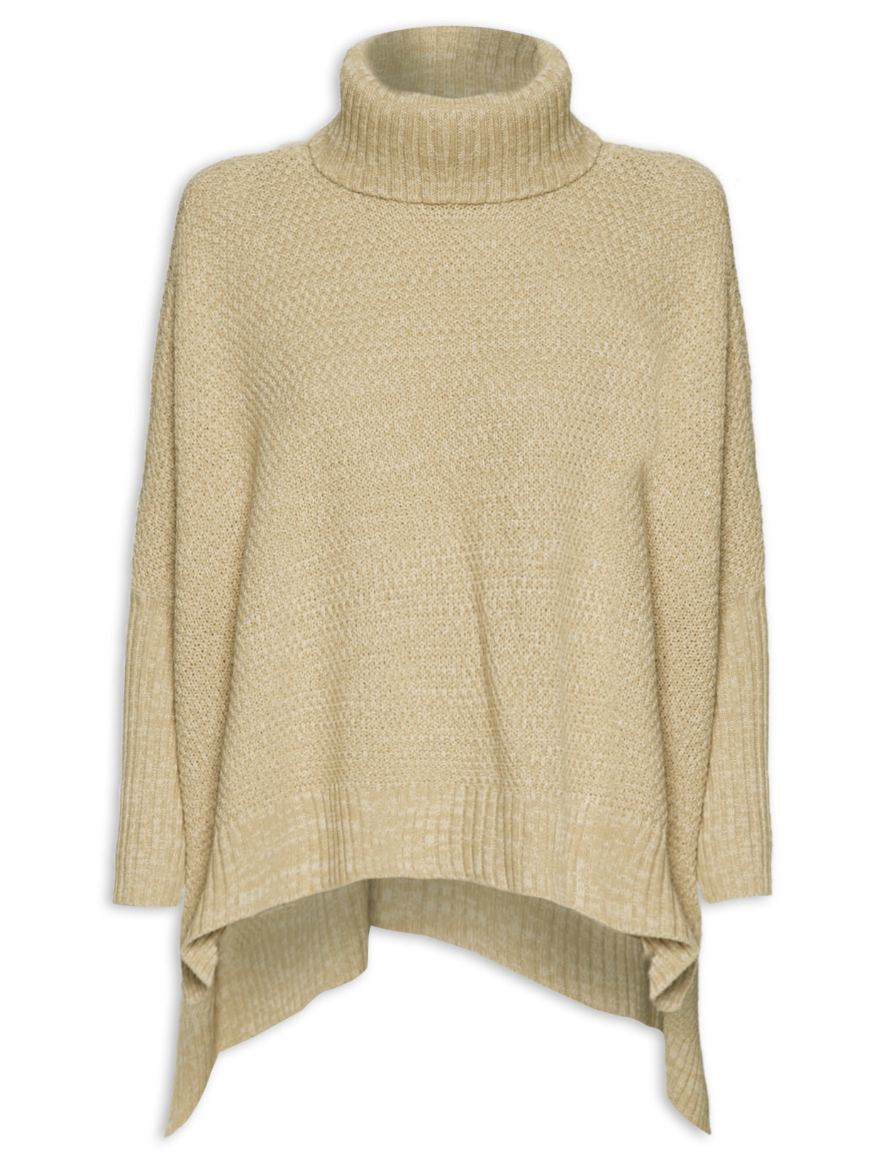 A blusa bege é confeccionada em tricot encorpado com alta elasticidade. A peça solta ao corpo possui gola alta, mangas, fendas laterais, barra mullet* e comprimento alongado.