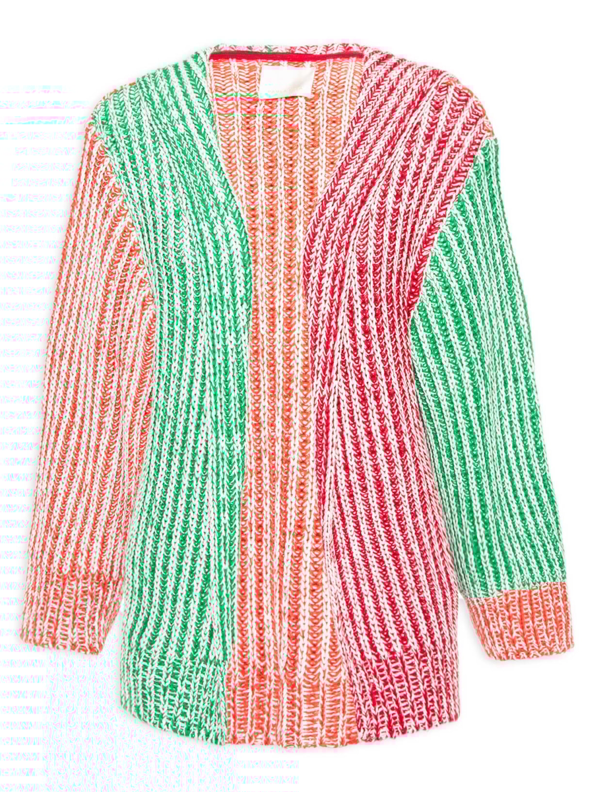 A blusa vermelha é confeccionada em tricot. A peça possui capuz aplicado, mangas longas, tramados em cores contrastantes, shape solto, caimento reto e  acabamento canelado.