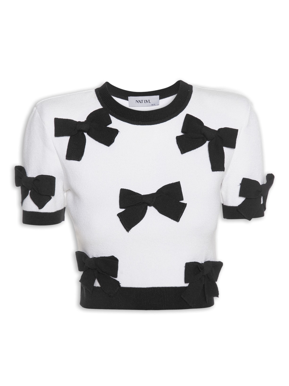 A blusa off white é confeccionada em tricot. A peça possui decote redondo, mangas curtas, linhas pretas nas mangas, barra e decote, aplicações frontais de laços em cor contrastante, comprimento cropped*, shape solto, caimento reto e acabamento canelado.