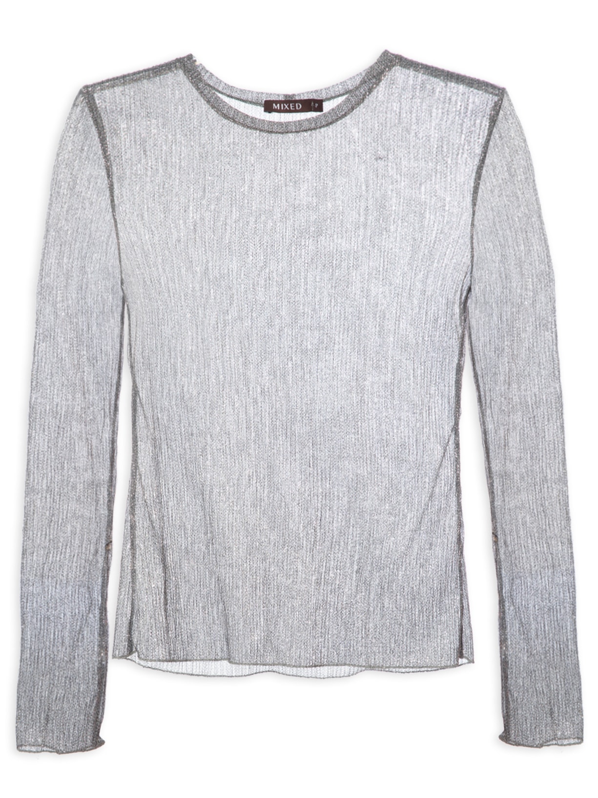 A blusa prata é confeccionada em tecido leve com fios de lurex, superfície texturizada e média elasticidade. A peça justa ao corpo possui decote redondo, mangas longas, transparência e sem forro.