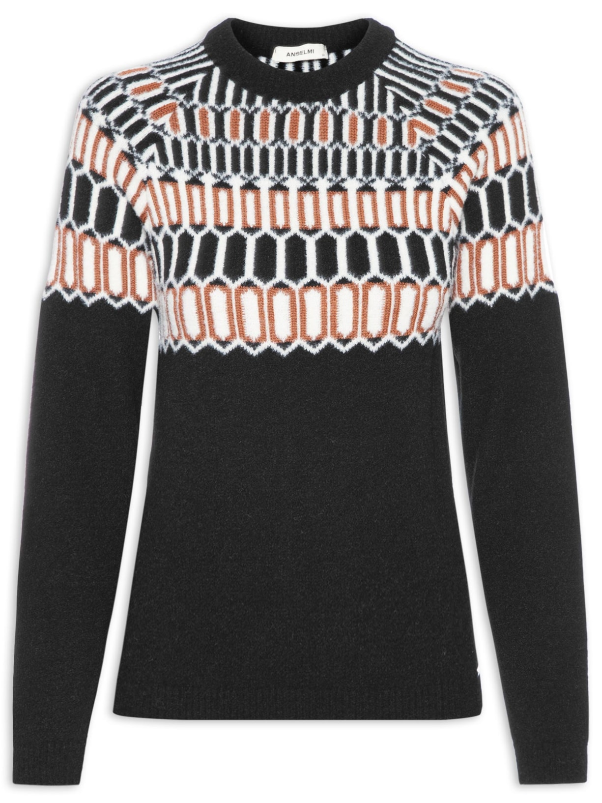 A blusa preta é confeccionada em tricot de média elasticidade. A peça solta ao corpo, possui decote redondo, mangas longas de modelo raglan, padronagem geométrica na parte superior em cores contrastantes e acabamento canelado.