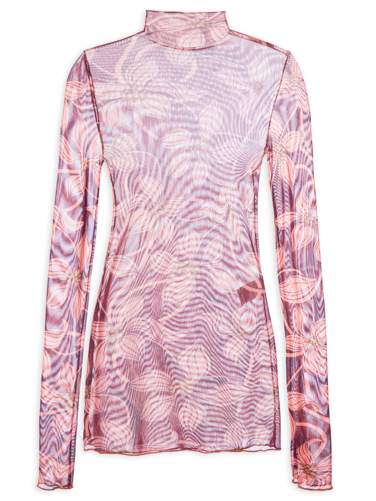 A blusa vermelha é confeccionada em tule com alta elasticidade. A peça justa ao corpo possui gola alta, ombros regulares, mangas longas, estampas florais em cores contrastantes e alta transparência.