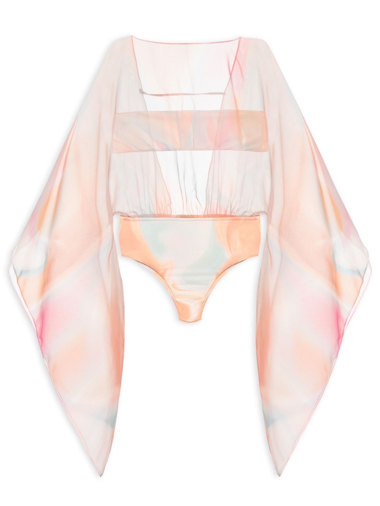 O body laranja é confeccionado em tecido leve sem elasticidade. A peça solta ao corpo possui decote redondo, mangas longas modelo sino, recorte posterior vazado com cordão fino, recorte na altura da cintura em malha justa, transparência e estampa tie dye em cores contrastantes. Acompanha top para uso opcional em malha justa de modelo tomara que caia, decote reto, elástico embutido no decote e na barra, forro, laterais largas e estampa tie dye em cores contrastantes.