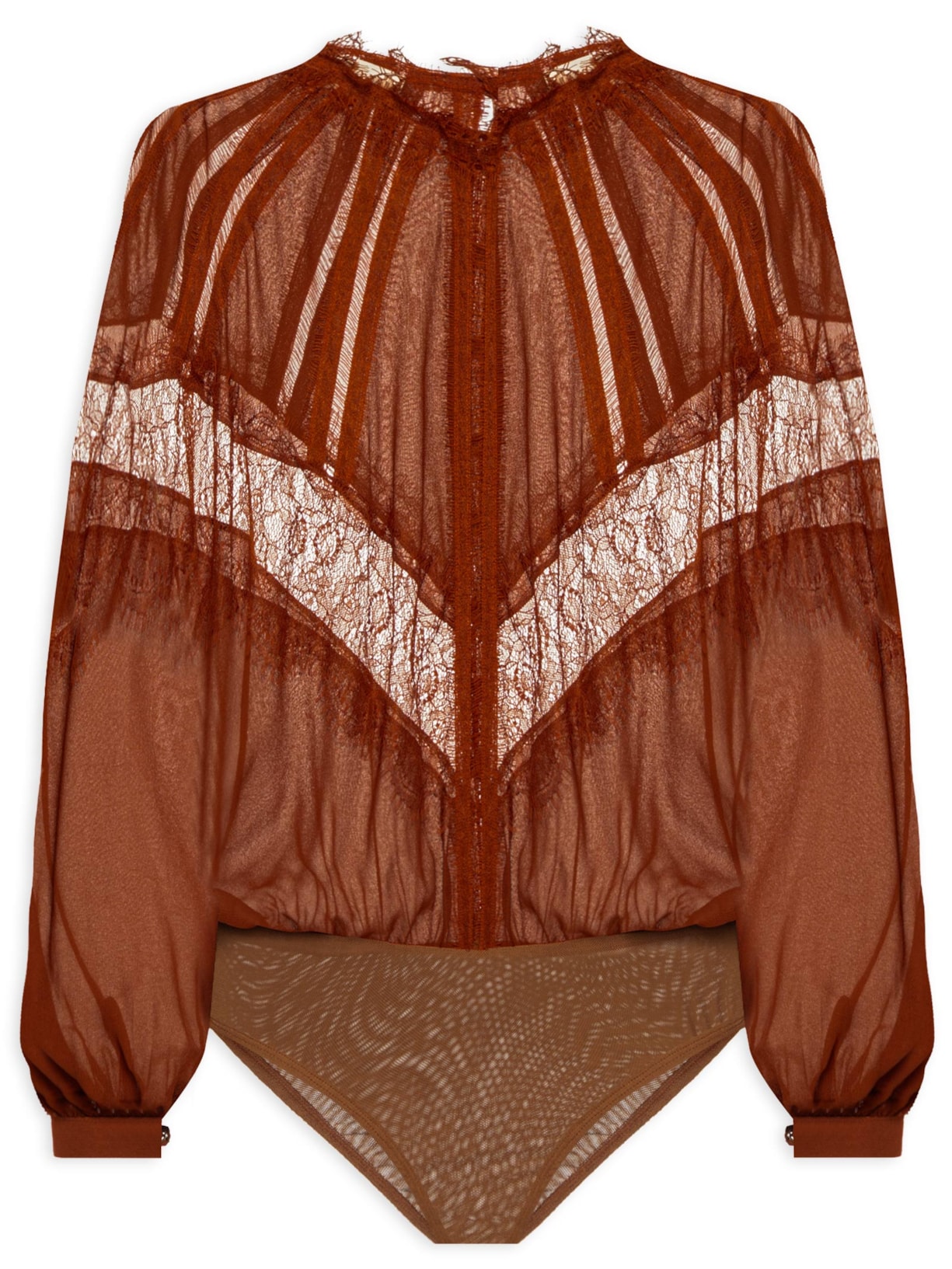O body marrom é confeccionado em tecido leve sem elasticidade. A peça solta ao corpo possui decote redondo, mangas longas morcego com abotoamento nos punhos, recortes com aplicação de renda com recortes vazados, parte inferior em tule, transparência, sem forro e fechamento inferior em botões de pressão e posterior em botões.