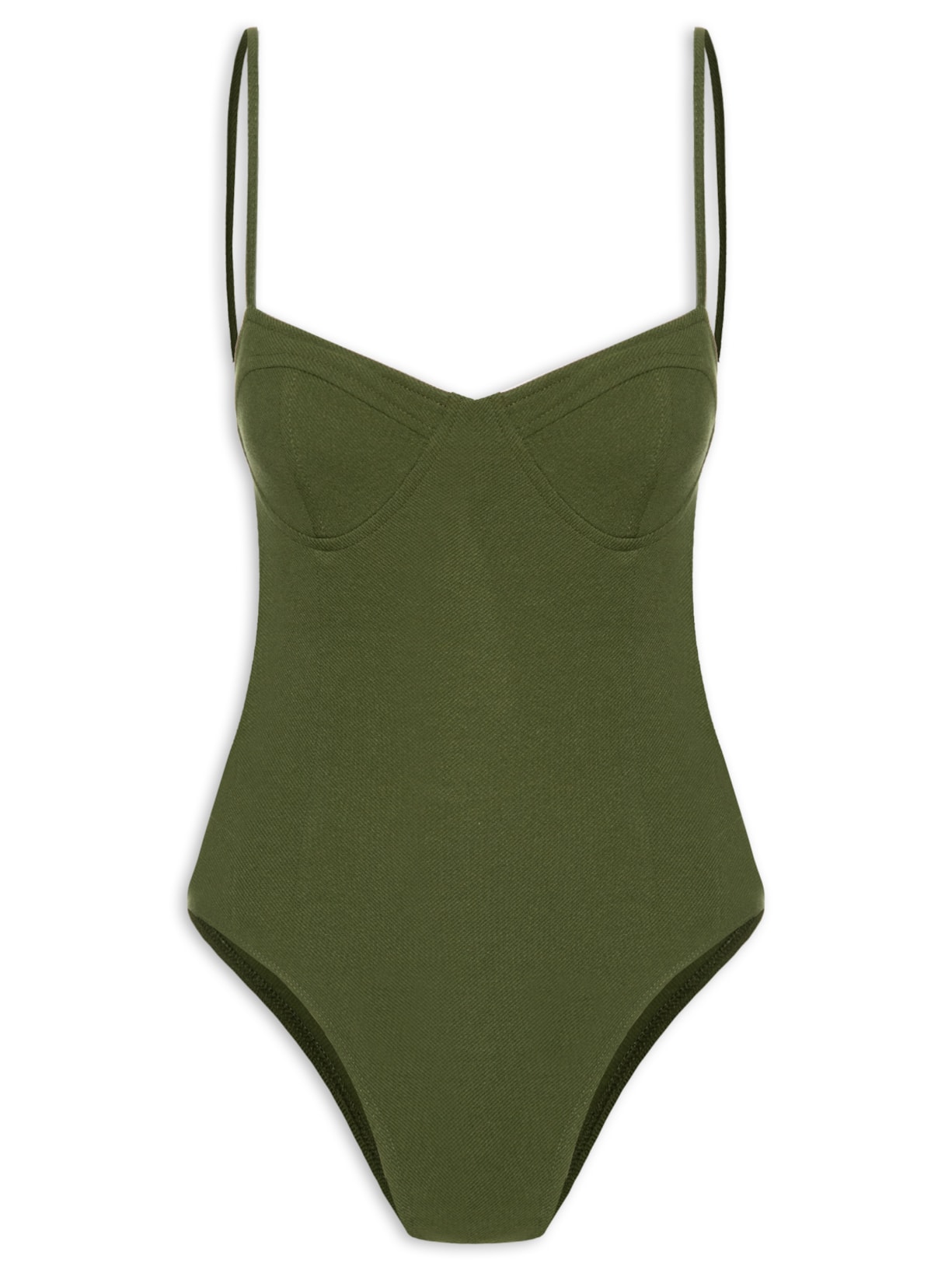 O body verde é confeccionado por malha com média elasticidade. A peça justa ao corpo possui decote meia - taça, alças finas, recortes frontais e posteriores, elástico embutido no decote posterior e nas cavas inferiores e fechamento por botão de pressão inferior.