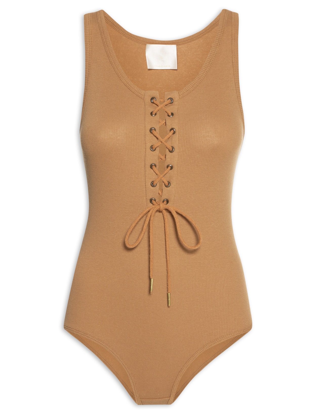 O body marrom é confeccionado em malha leve com superfície canelada de média elasticidade. A peça justa ao corpo, possui decote em U, alças médias, cavas estendidas, recorte frontal vazado com cordões embutidos para amarração frontal, forro na parte inferior e sem fechamento.