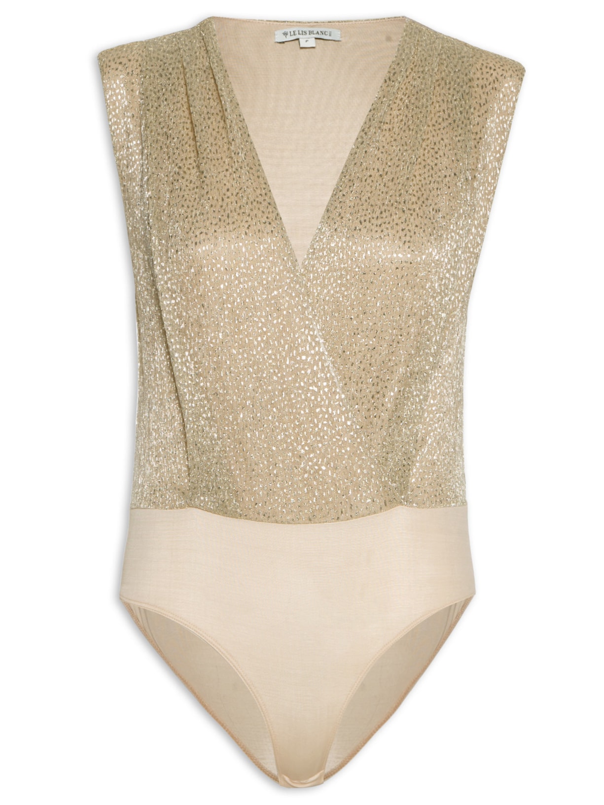 A blusa dourado é confeccionada em tecido leve com superfície plissada, fios de lurex e sem elasticidade. A peça justa ao corpo possui decote V transpassado, alças largas com detalhe de pregas frontais, tag metálica da marca aplicada na parte posterior, leve transparência, forro, parte inferior em malha leve, sem bojo e fechamento inferior em botões.