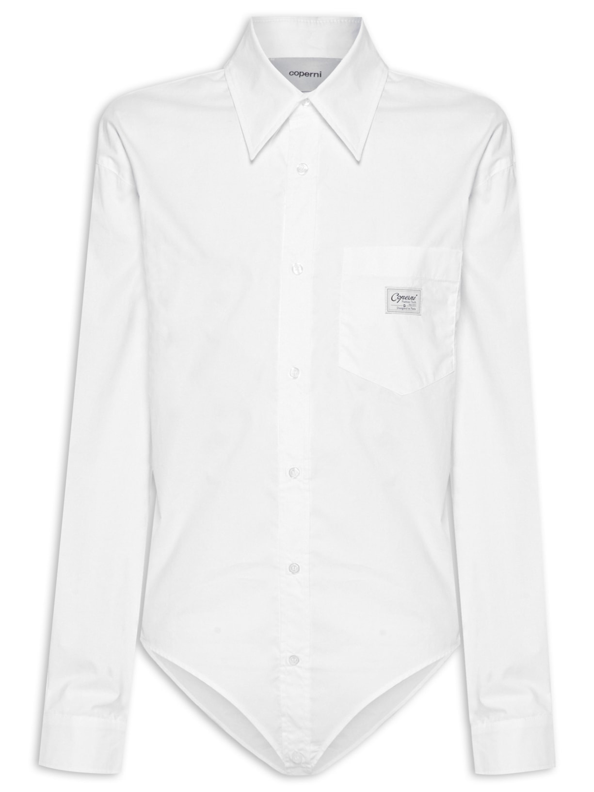 O body branco é confeccionado em tecido leve sem elasticidade. A peça solta ao corpo possui colarinho clássico, ombros estendidos, mangas longas com abotoamento nos punhos, bolso frontal com tag da marca aplicada na altura do busto, recorte posterior com prega, leve transparência e fechamento frontal e inferior em botões.