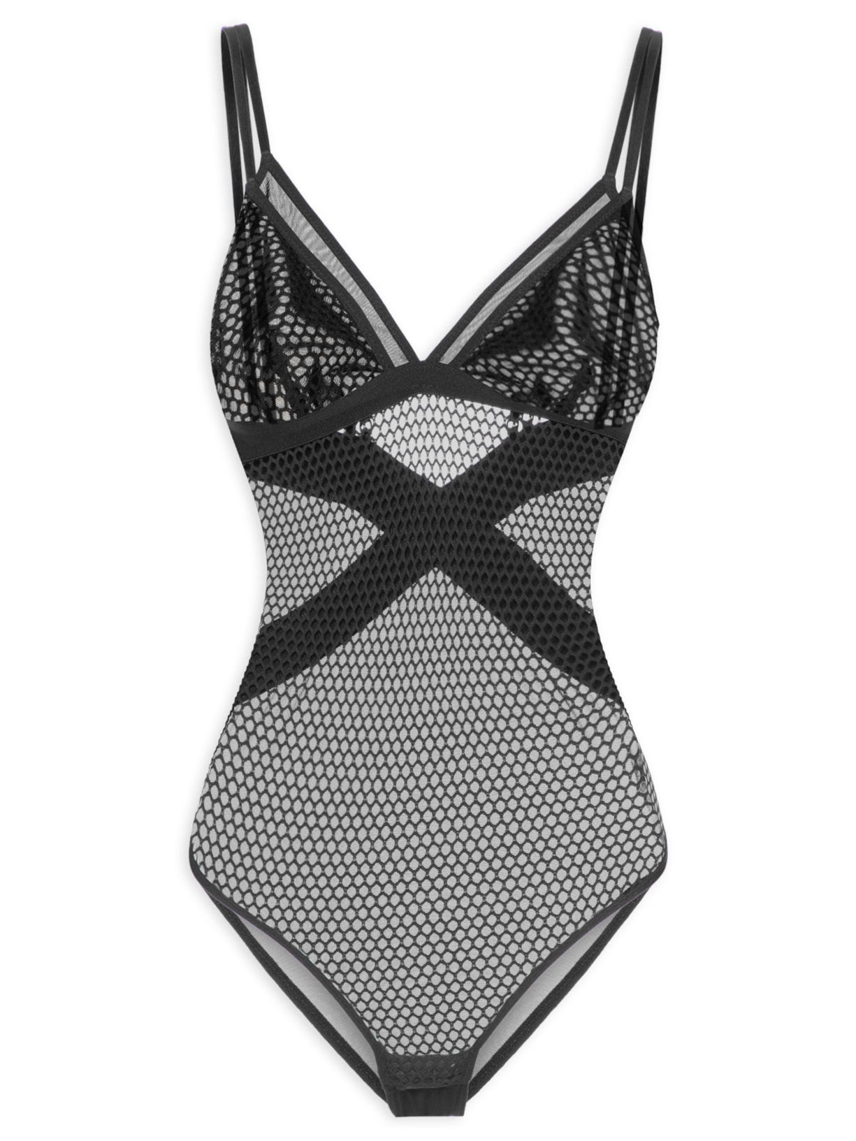 O body preto é confeccionado por tela com média elasticidade. A justa ao corpo possui decote v, alças finas dupla com ajuste, parte posterior em tule, elastico embutido na parte inferior e decote posterior, forro no busto em tule, transparência e fechamento inferior por botão de pressão.