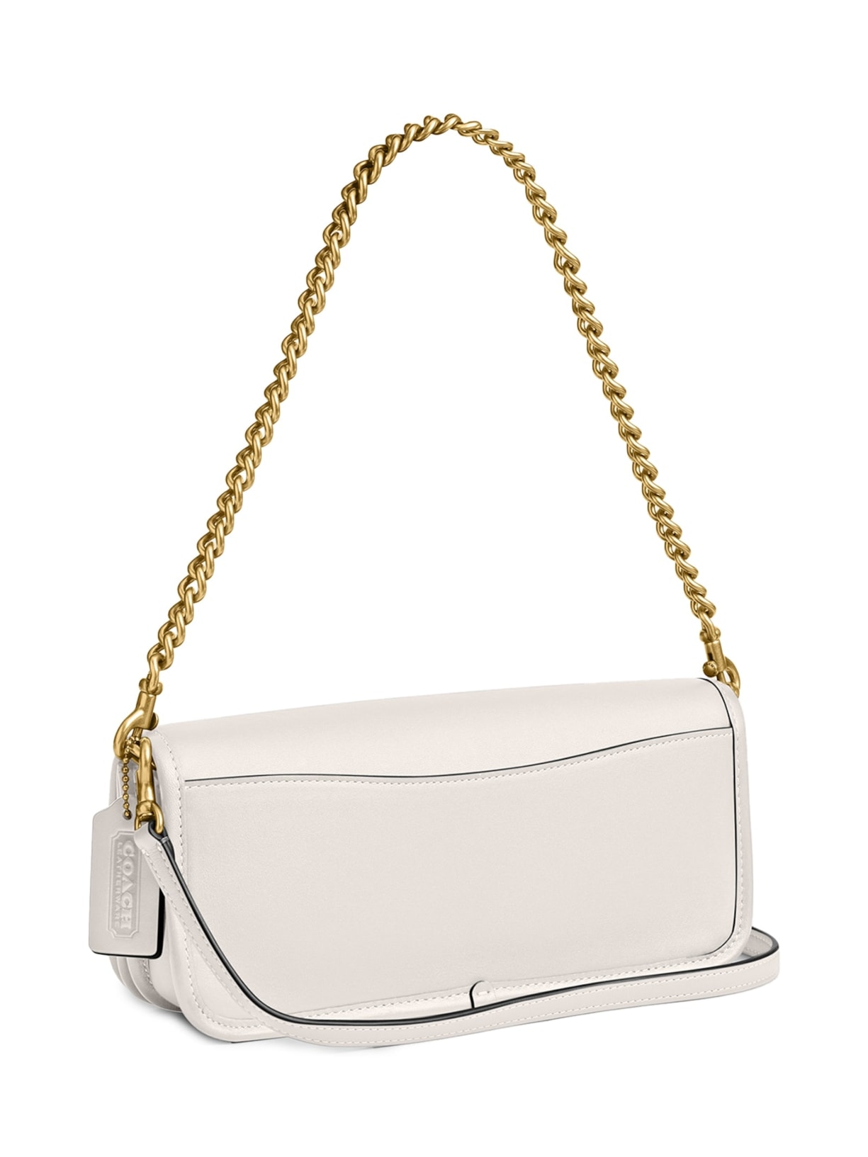 A bolsa branca é produzida em couro. A peça possui formato retangular, tamanho médio, formato retangular, compartimento interno com bolso com fechamento por zíper, alça de mão em corrente metálica removível, alça de ombro removível e fechamento frontal por aba e fecho metálico de encaixe.