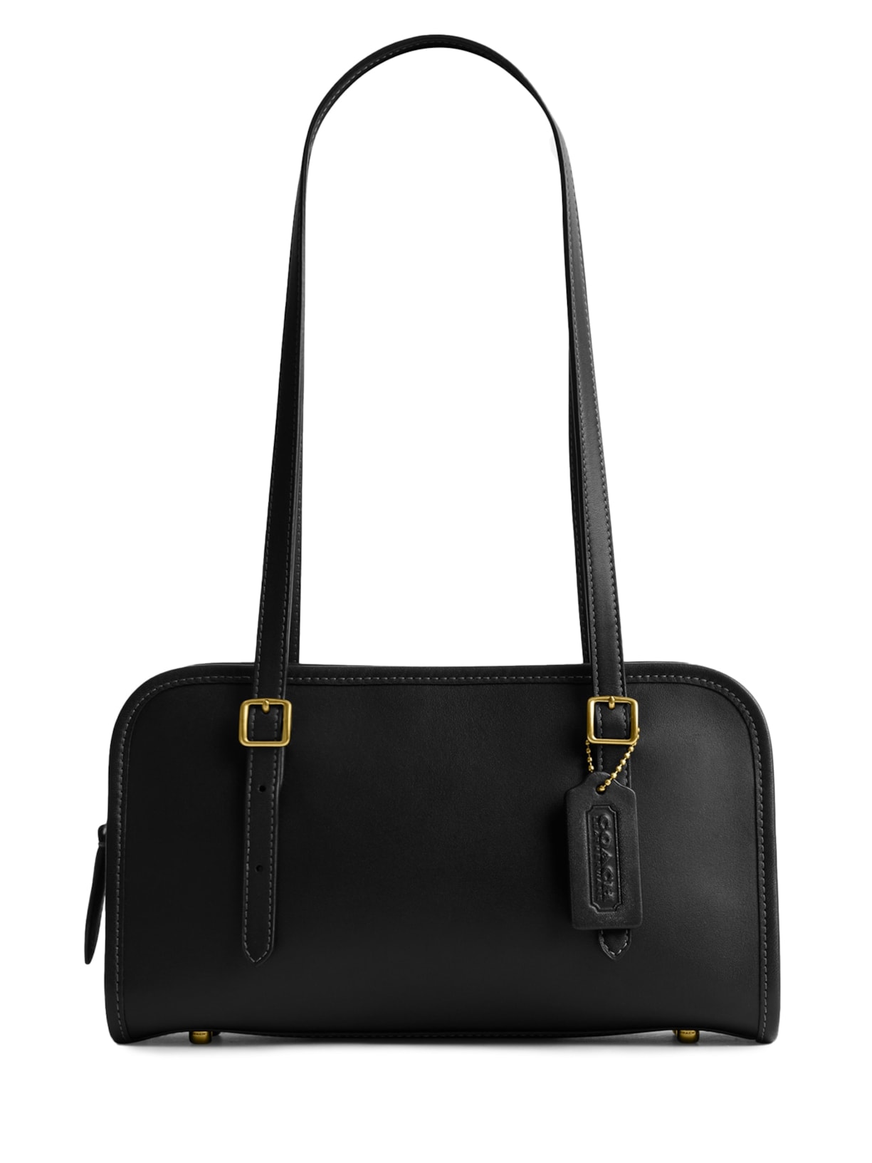 A bolsa preta é produzida em couro. A peça possui tamanho médio, formato retangular, compartimento interno amplo, alças de mão fixas, tag com nome da marca aplicado em couro na parte frontal e fechamento superior por zíper.
